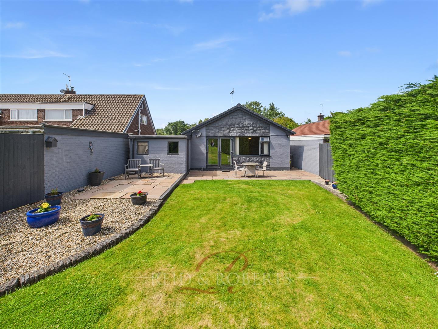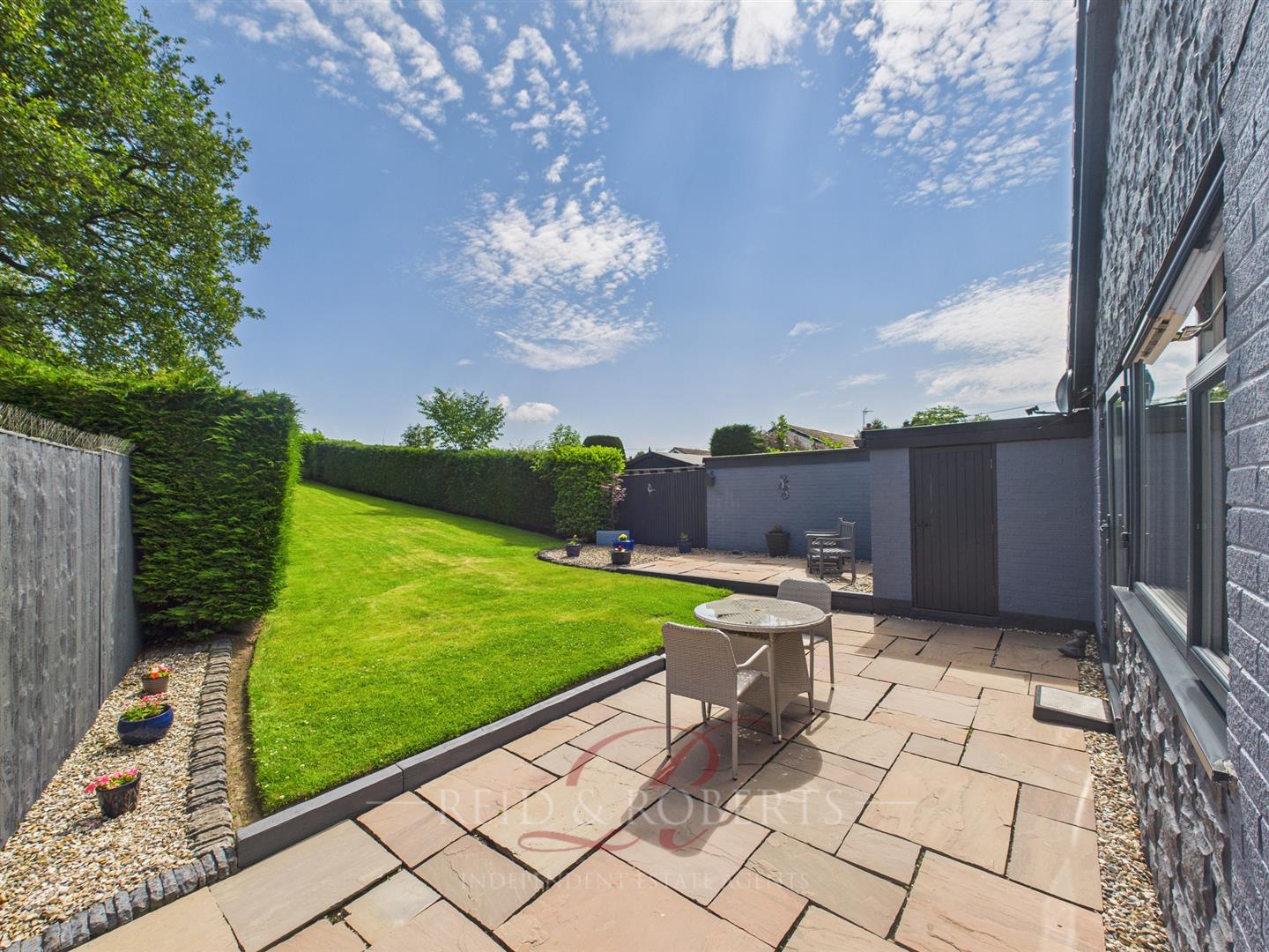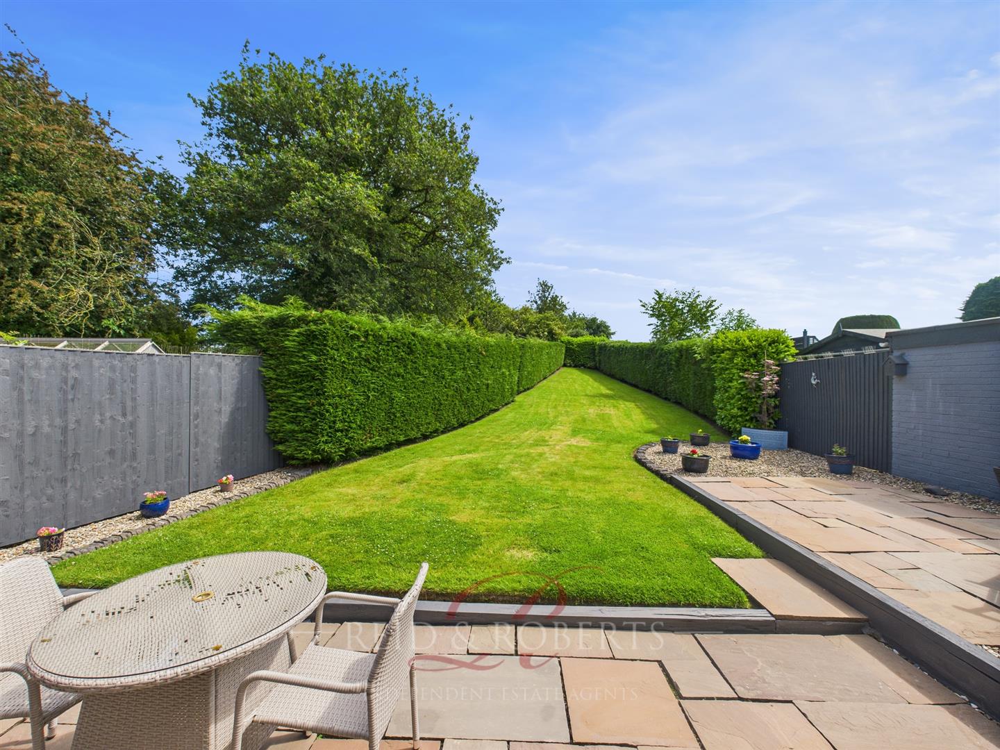 The rear garden is a standout feature private and beautifully landscaped. You are first welcomed by an Indian stone patio area ideal for alfresco dining, with steps leading up to a second patio space, also laid in Indian stone. The garden continues with a long lawned area, a gravelled section ideal for pots and planting, and is bordered by mature conifer hedging and fence panelling, offering a great sense of privacy and tranquillity.