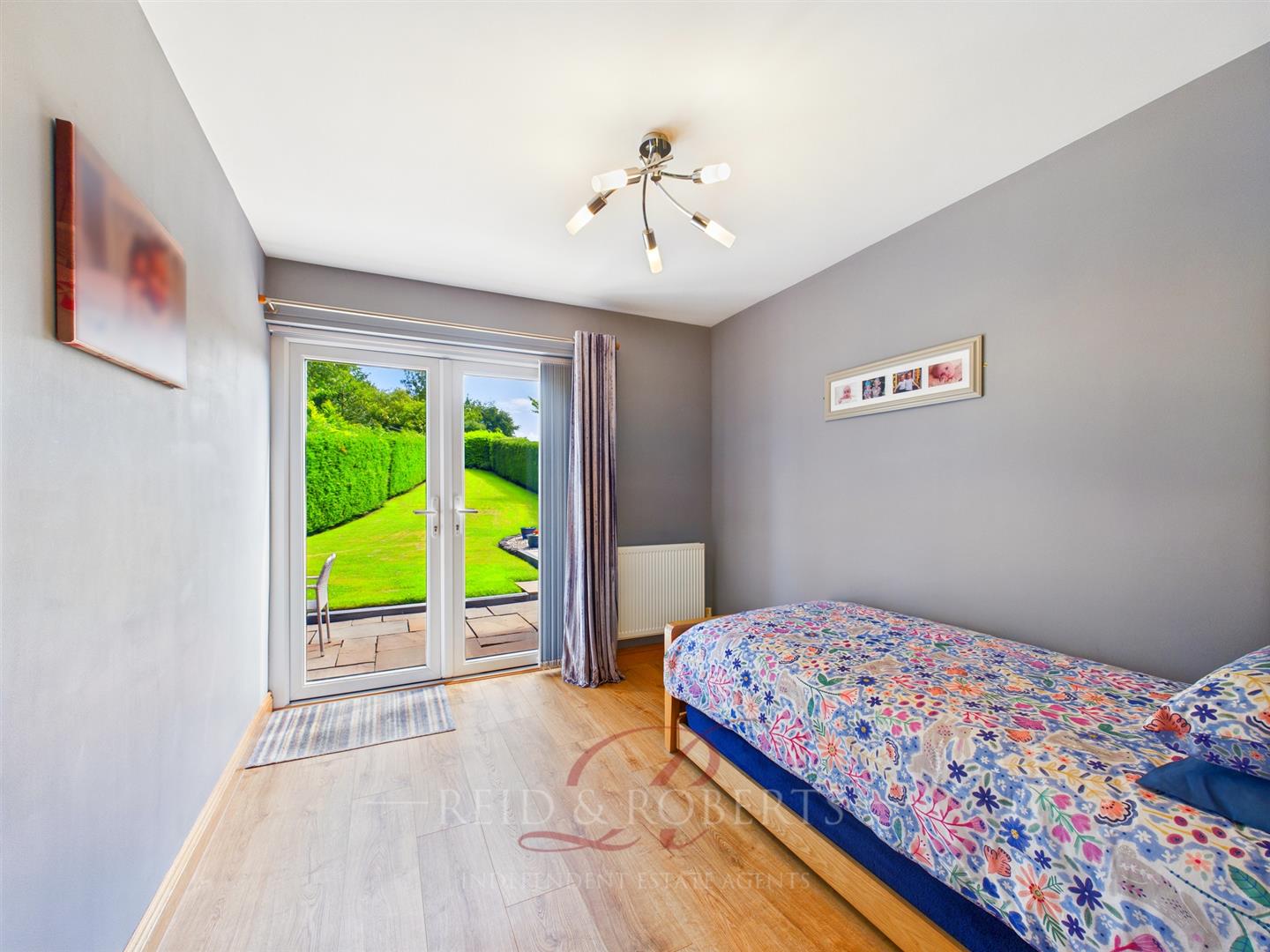 The second bedroom is another excellent-sized double, with wood-effect laminate flooring, central ceiling light point, and a double panel radiator. UPVC double doors lead directly out to the rear garden, making this room ideal as a guest bedroom, office, or hobby space.