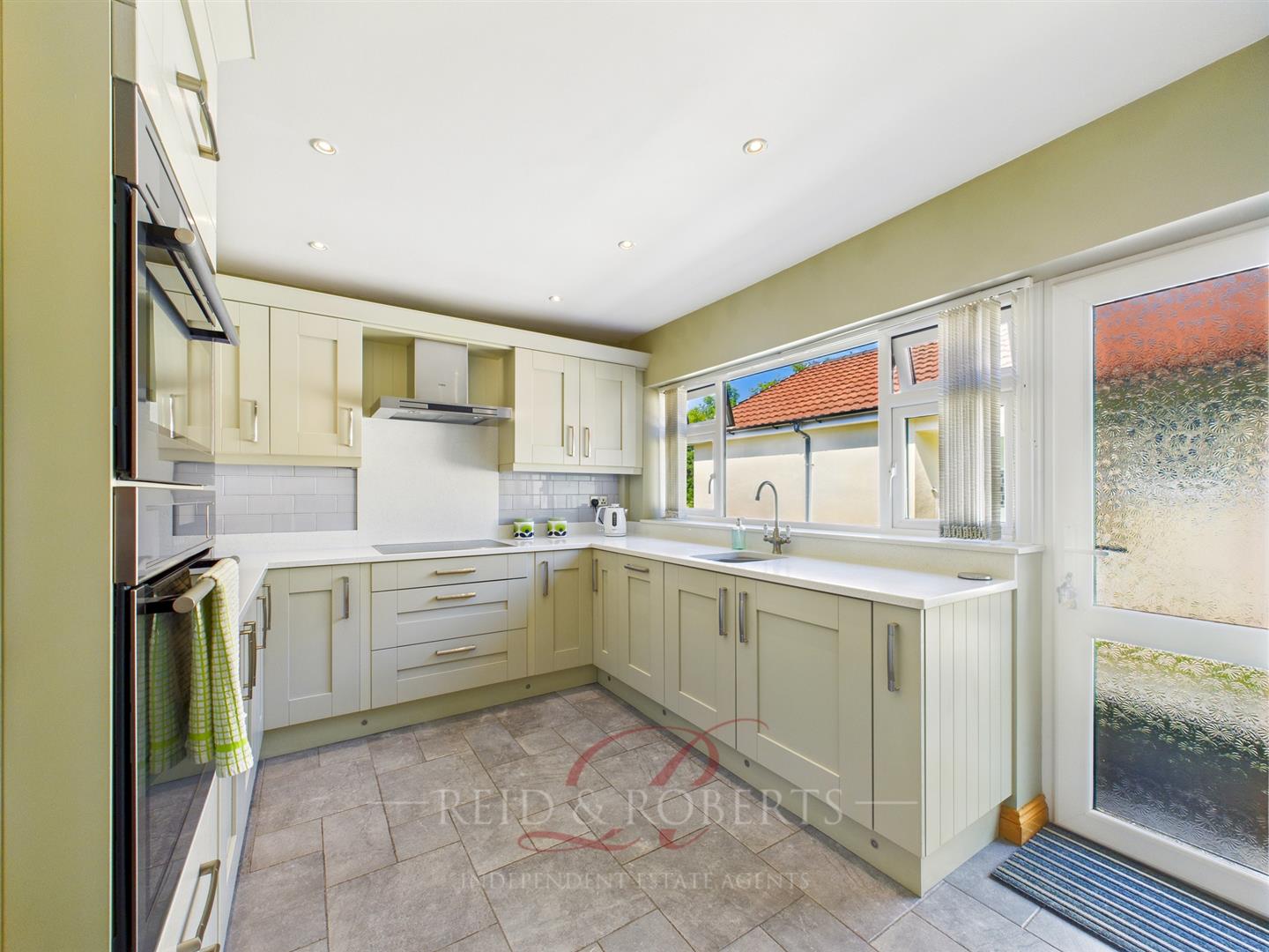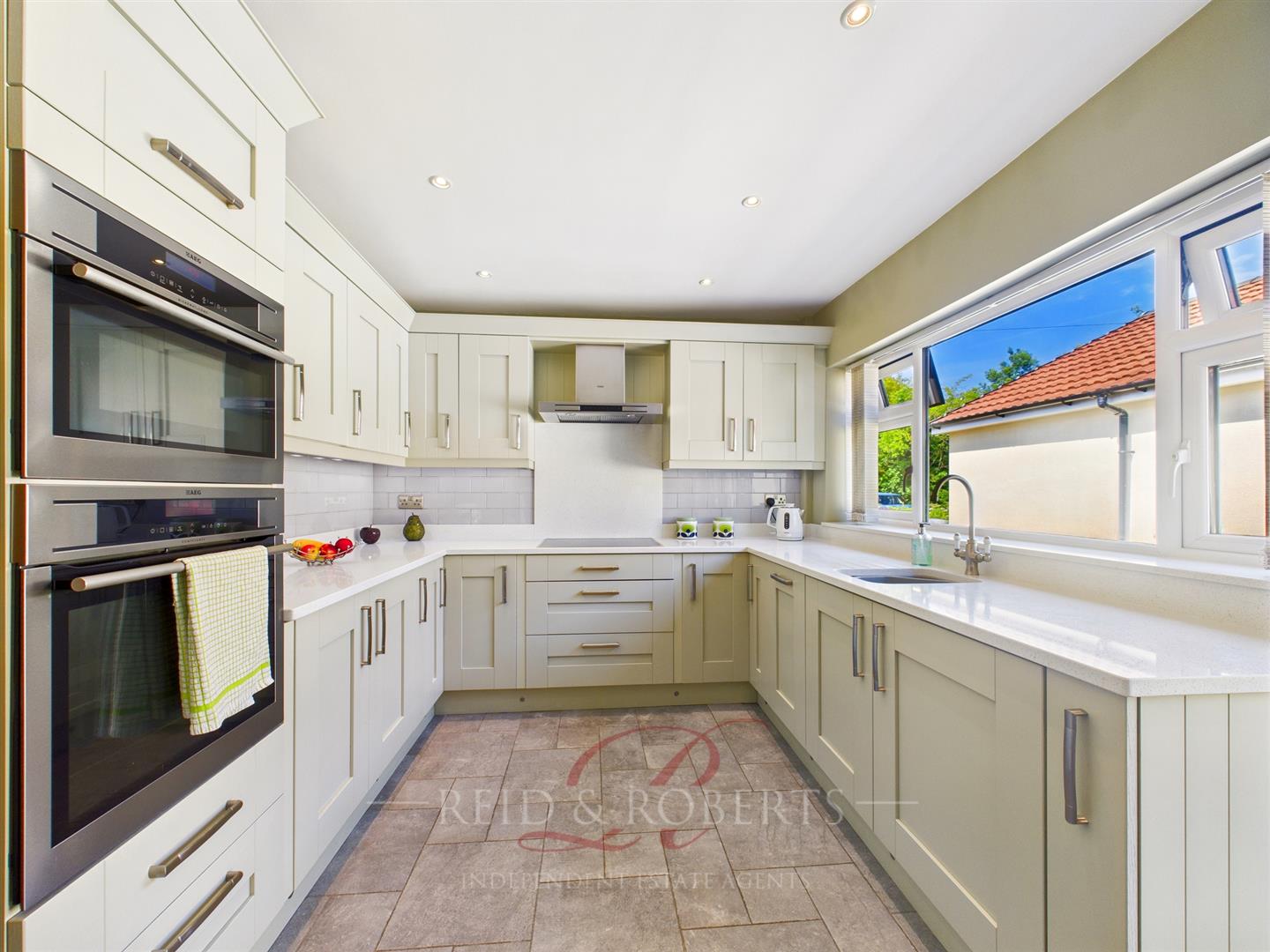 The newly fitted kitchen is a true showstopper, designed for both form and function. Featuring a full range of soft-close wall and base units topped with quartz worktops, this culinary space includes stylish quartz upstands and splashback. Equipped with premium AEG appliances, including an eye-level oven/grill, four-ring induction hob with matching AEG stainless steel extractor hood, and an integrated stainless steel sink with quartz drainer. There's also under-cabinet lighting, an integrated fridge, dishwasher and a charging port that is cleverly built into the worktop, leaving ample space for a dining table. Recess spotlighting, a large UPVC window with top and side openers, and a UPVC glazed door with frosted panel provide abundant light and access to the side elevation. Tiled flooring and a double panel radiator complete this sophisticated room.