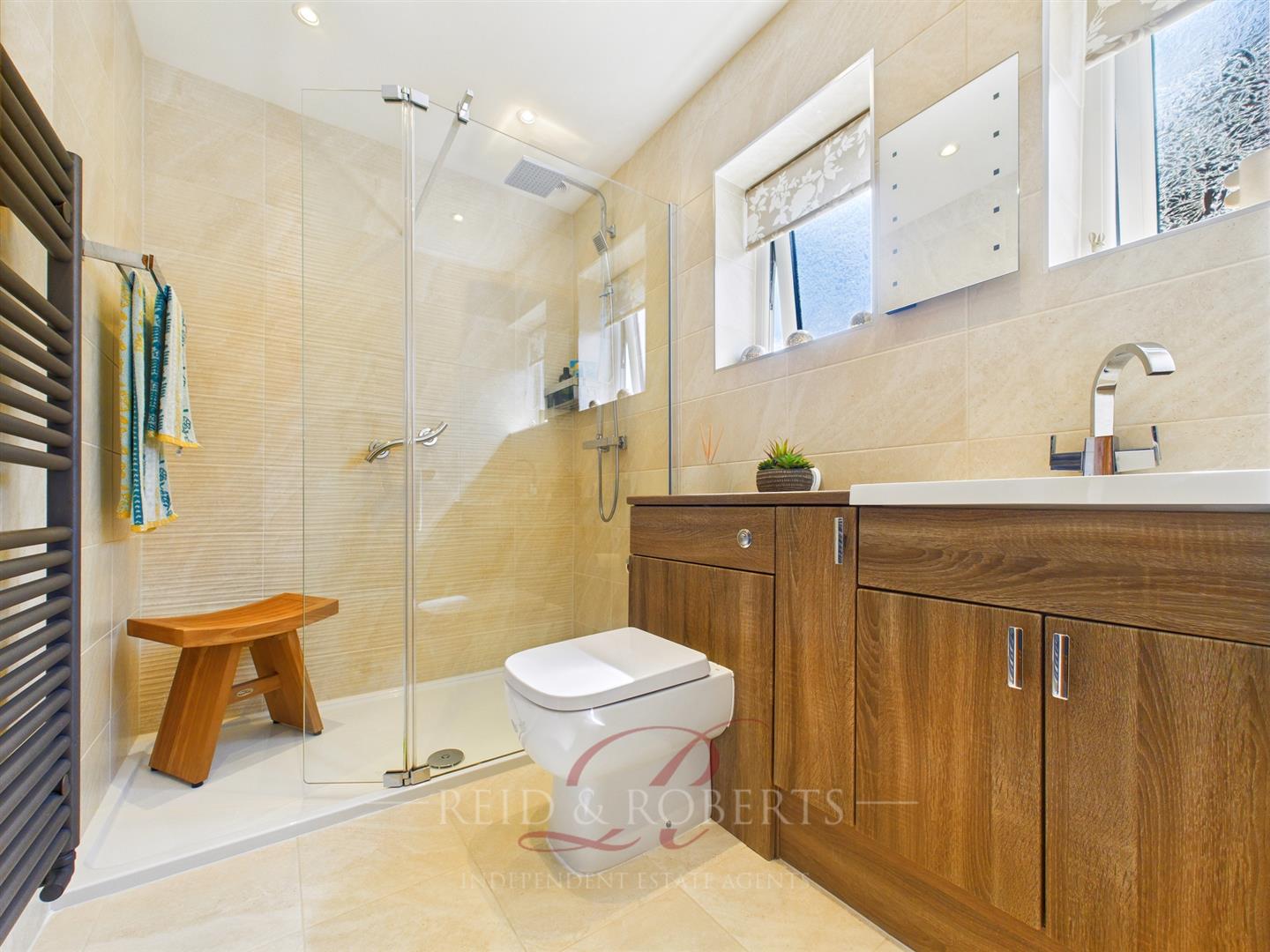 Beautifully appointed, the stylish shower room features a modern three-piece suite, including a large double shower cubicle with both waterfall and hand-held attachments. Additional highlights include a close-coupled WC, washbasin with mixer tap, fully tiled walls and floors, wall-mounted chrome heated towel rail, and recessed spotlighting. Two double-glazed UPVC frosted windows to the side elevation provide light and privacy.