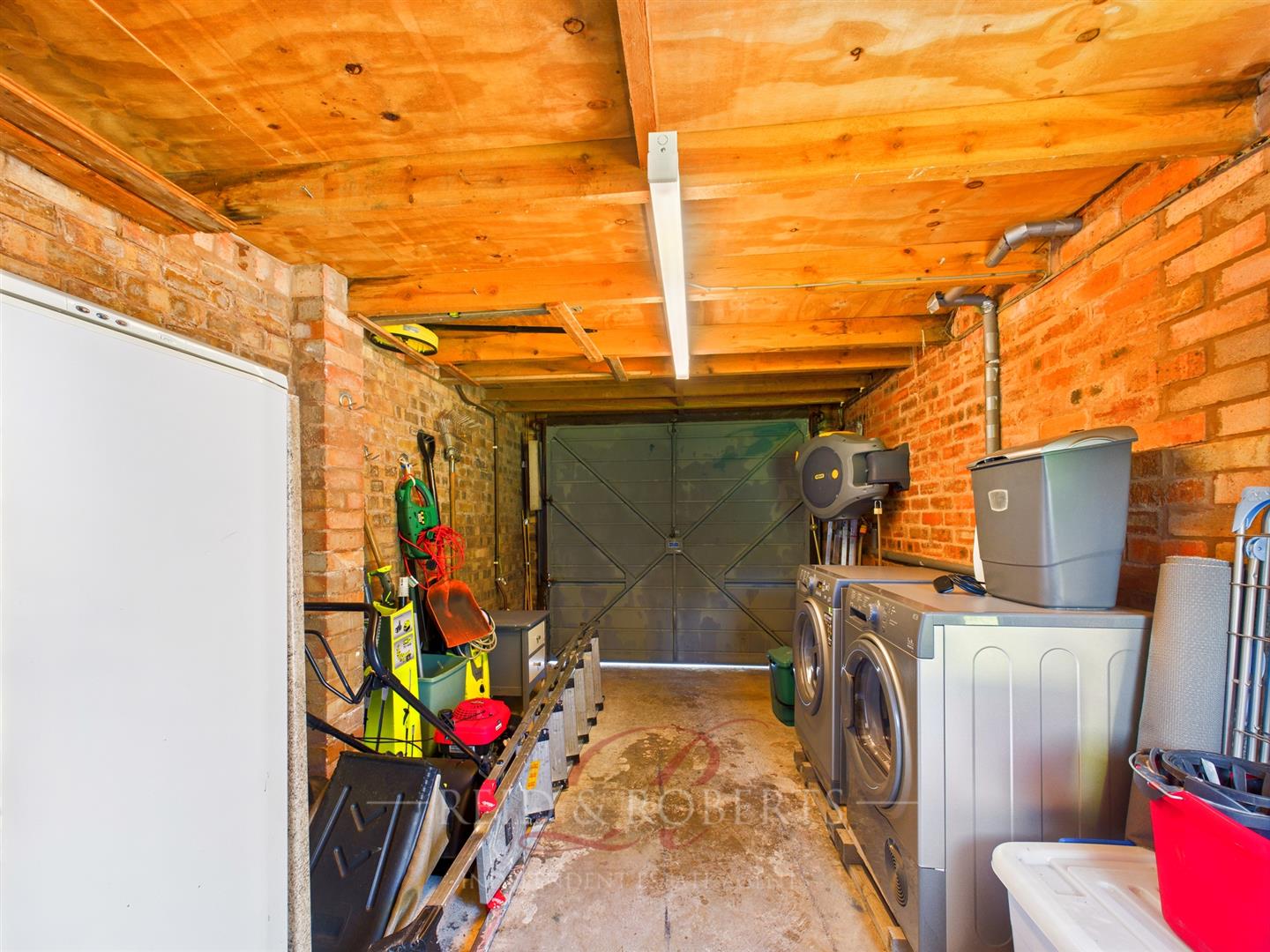 A wooden gate leads to a detached garage with electricity, lighting, and power sockets. An up-and-over door provides access from the front. The home is approached via a block-paved driveway offering ample off-road parking and continues along the side of the home to the entrance door, where a decorative composite door with frosted glazing adds charm and security.