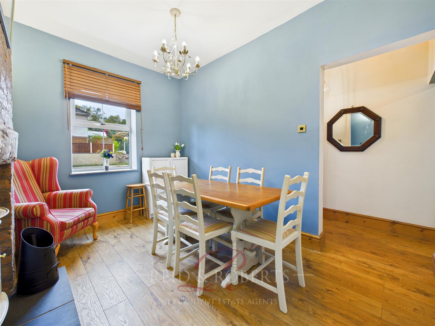A beautiful exposed brick chimney breast with a rustic wooden mantel and tiled hearth, currently offering space for an electric burner which creates a striking focal point in this charming room. At present, it serves as a separate formal dining area, ideal for family meals or entertaining guests, though the home’s versatile layout means this space could just as easily function as a cosy living room. The room is finished with wood-effect laminate flooring, a panelled radiator, a UPVC double-glazed window to the front elevation, ceiling and wall lighting, and convenient power points throughout.