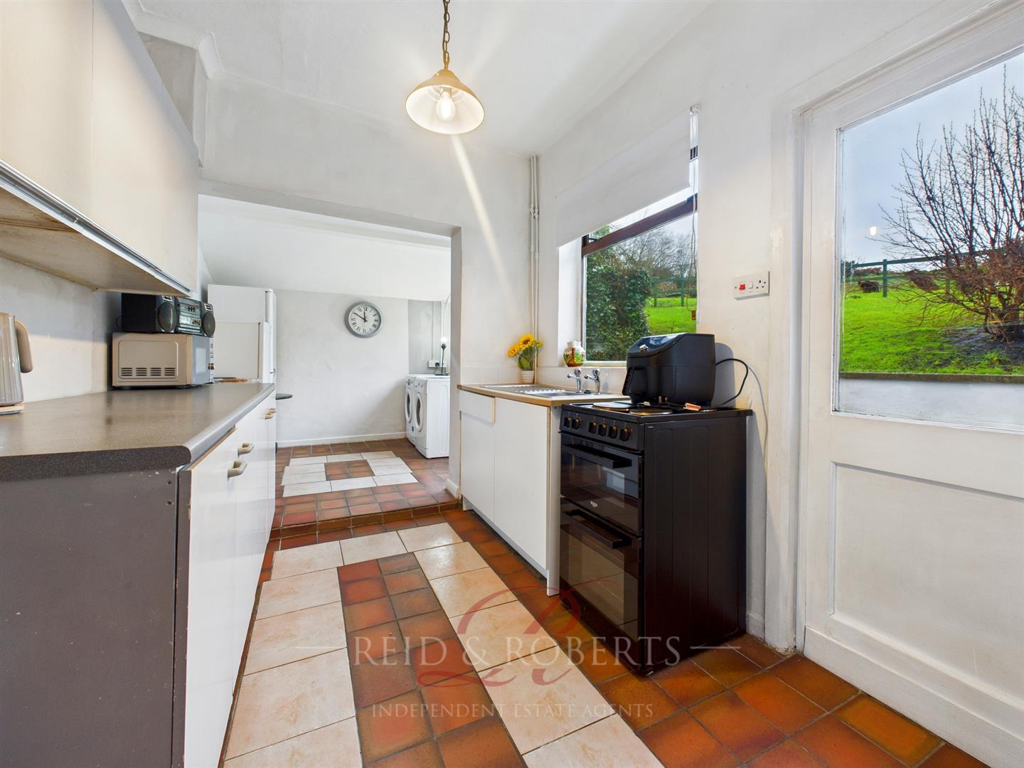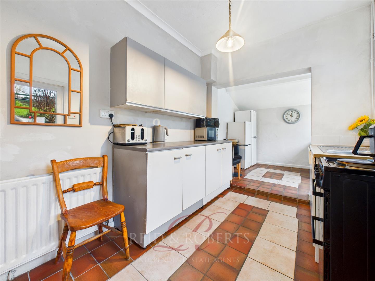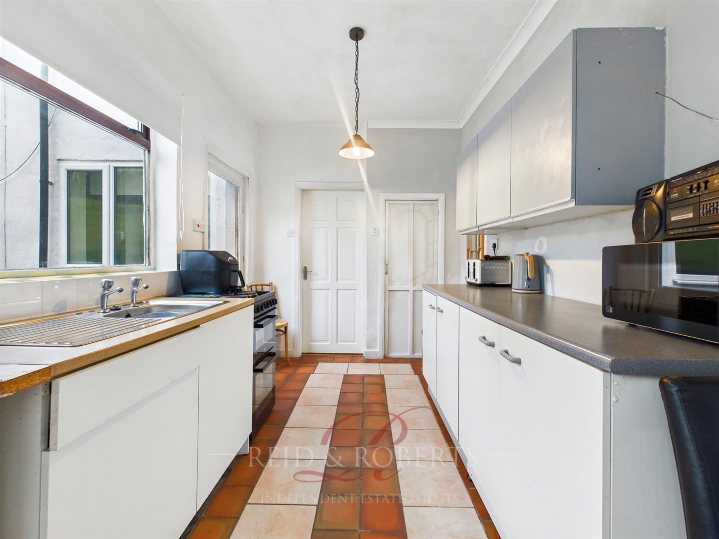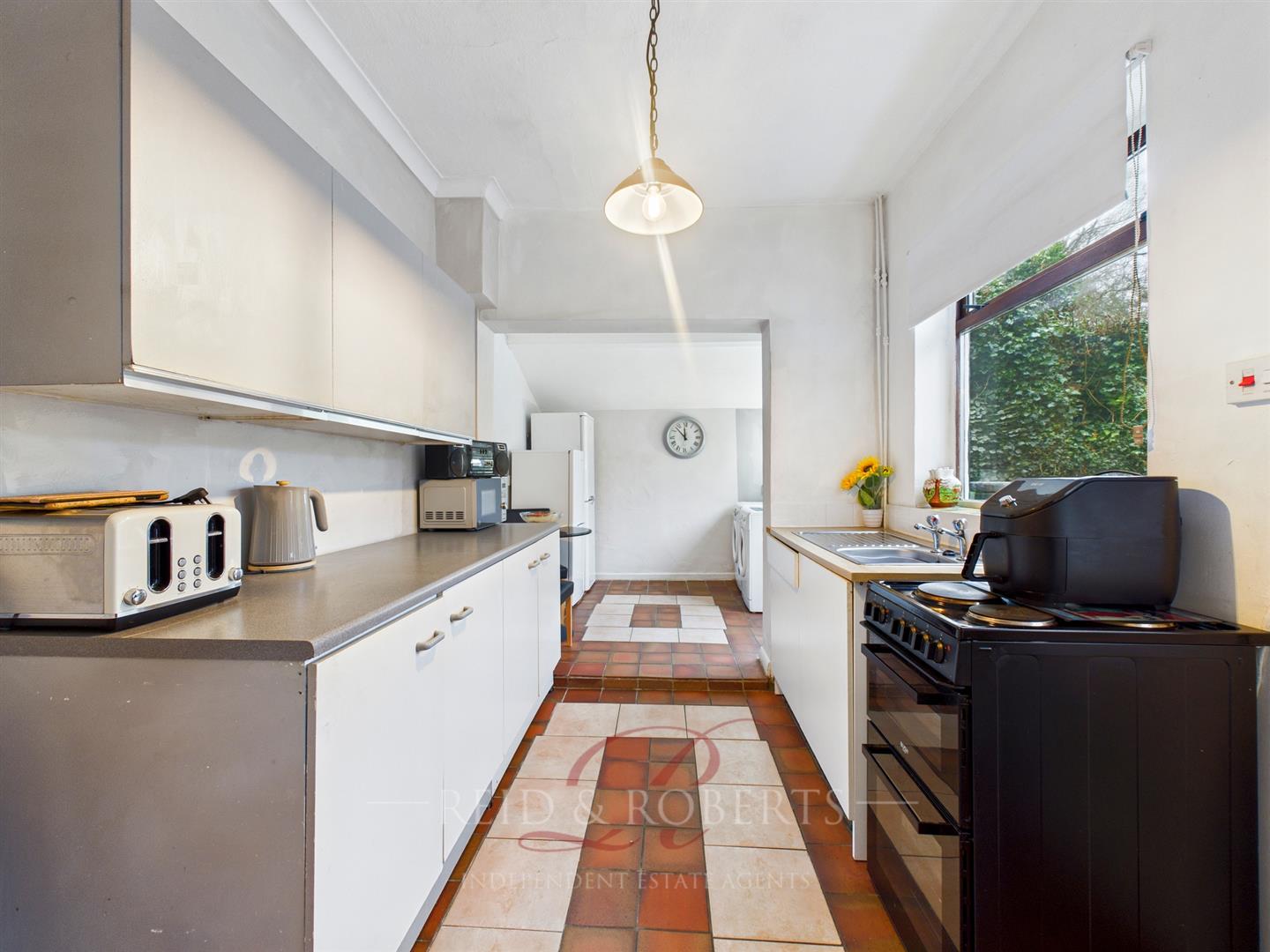 The kitchen features a practical range of wall and base units with worktop surfaces, complemented by a stainless-steel sink with drainer and taps. There’s ample space for an oven, while a double-glazed window offers views of the garden. Tiled flooring and under-stairs storage cupboard with lighting add both functionality and practicality to this well-designed space.