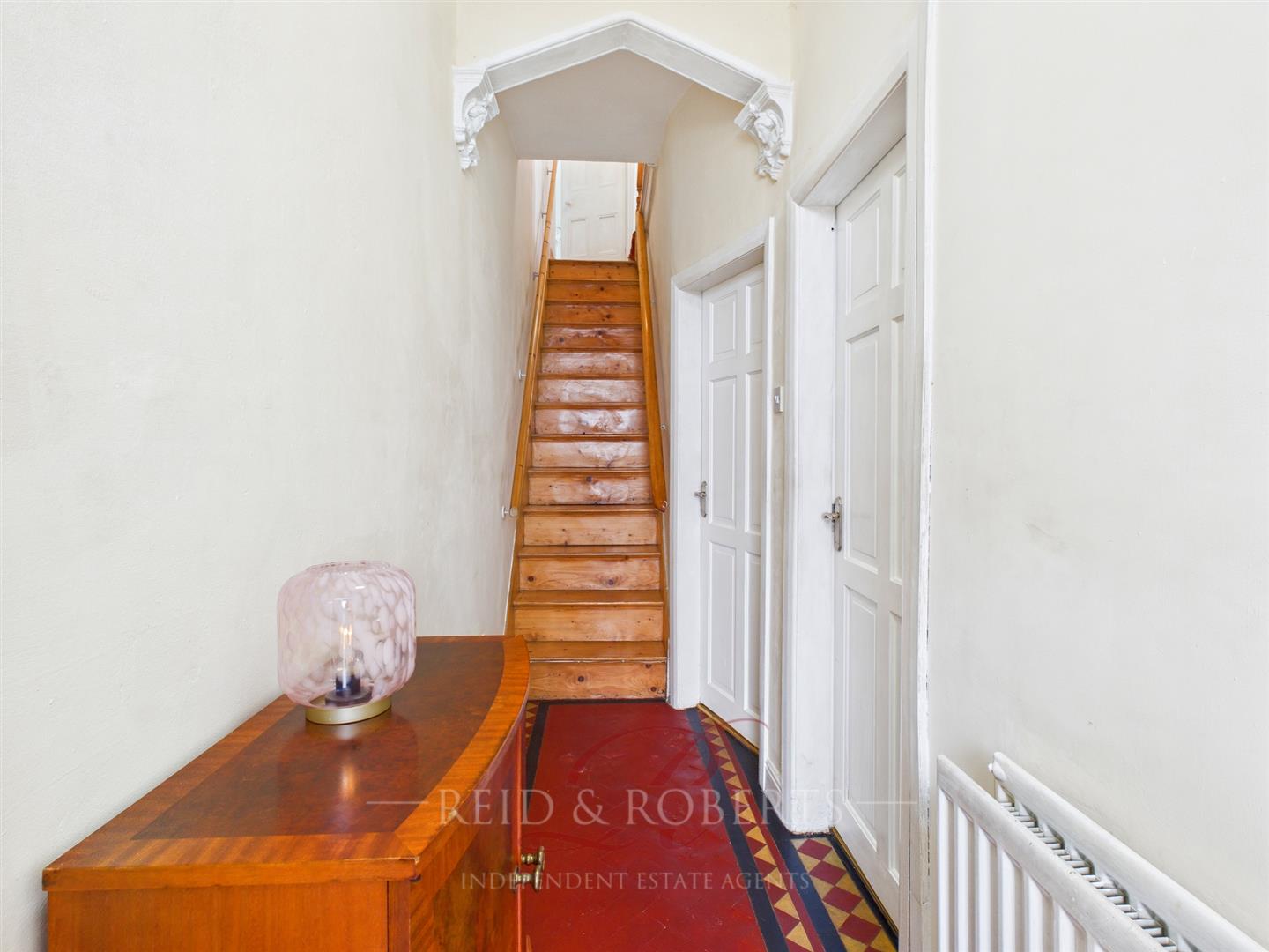 Opening into a bright, inviting hallway. A stunning stained-glass window above the front door adds classic character, beautifully complemented by original tiled flooring. The hallway flows seamlessly to the lounge, dining room, and first-floor stairs, featuring an elegant archway and a discreet wall-mounted cupboard housing the fuse box.
