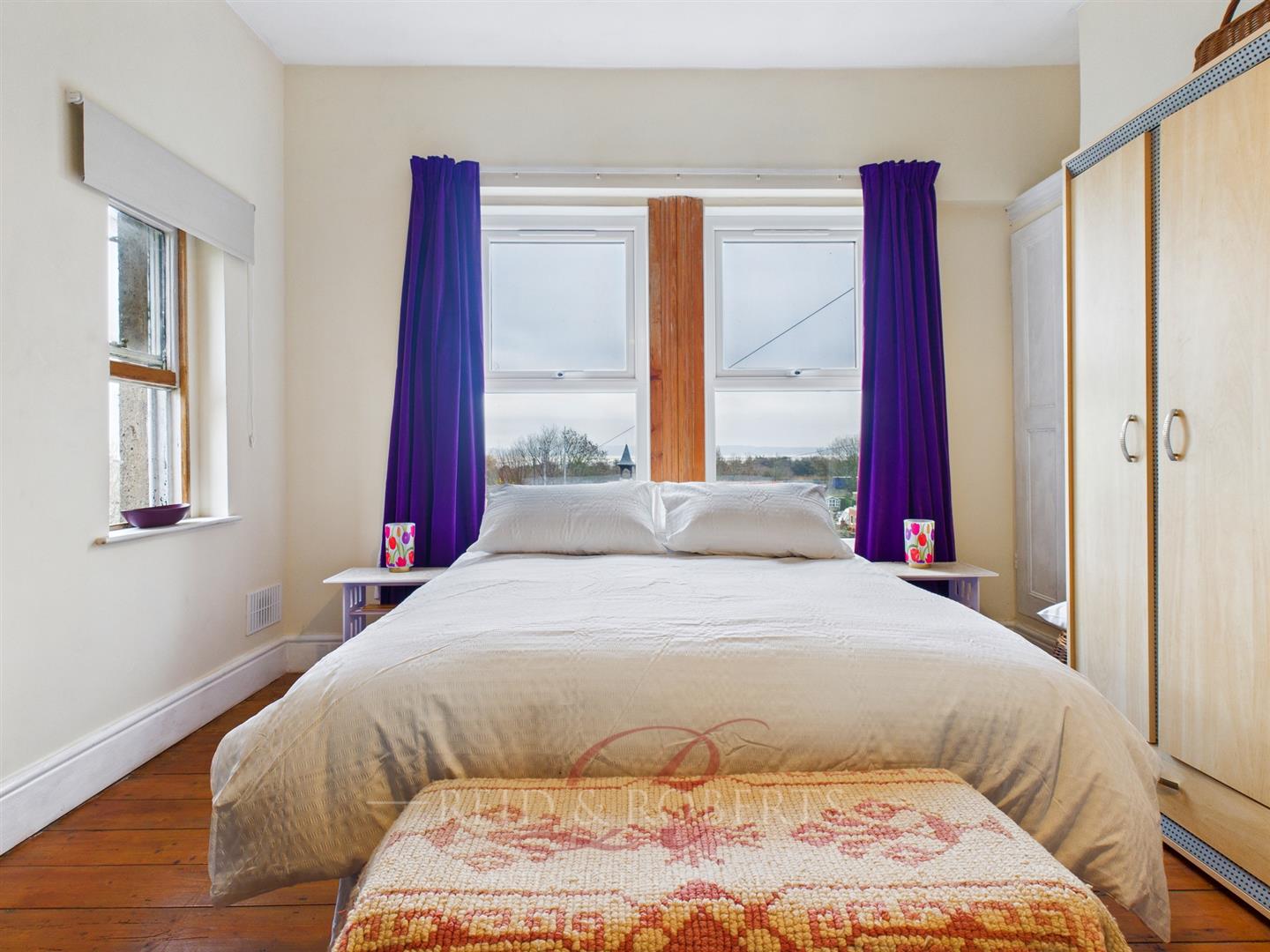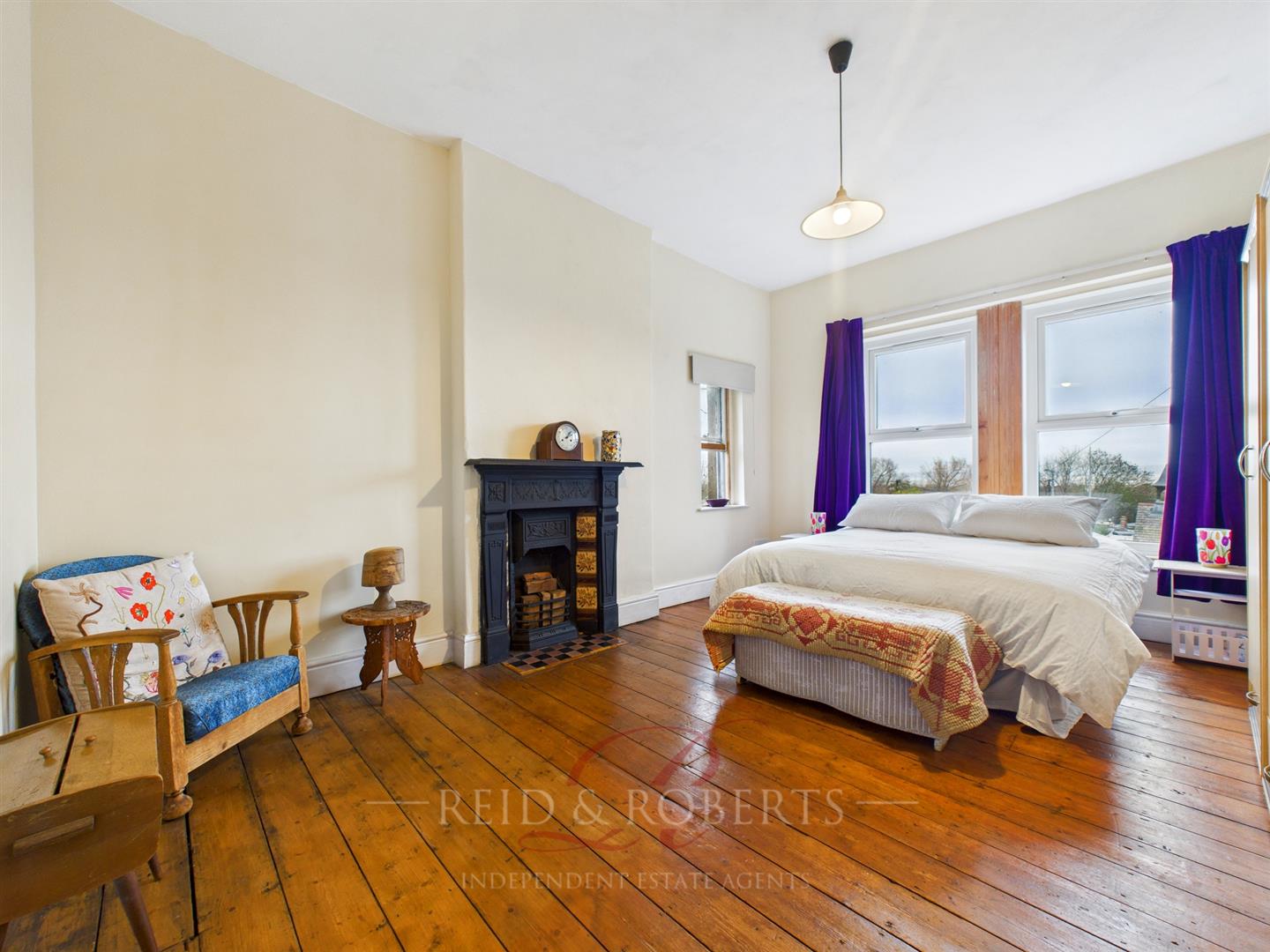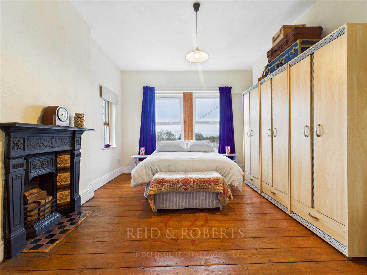 A generously proportioned main bedroom, combining period charm with modern comfort. It features a decorative fireplace, wooden flooring, radiator, and a built-in storage cupboard, providing ample space for a bed and additional furniture. Newly fitted UPVC double-glazed windows to the front elevation frame lovely views towards the Dee Estuary and beyond, while an original wooden sash side window preserves the home’s character and timeless appeal.