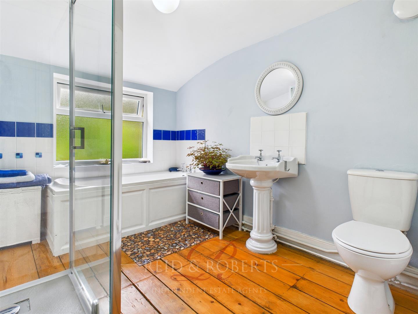 Featuring a stylish four-piece suite, this elegant space includes a W.C, a traditional pedestal sink with taps and tiled splashback, a panelled bath, and a separate shower cubicle with a wall-mounted shower. Partially tiled walls, wooden flooring, a radiator, and a newly fitted UPVC double-glazed frosted window to the rear elevation combine practicality with refined style, creating a bright and functional family bathroom.