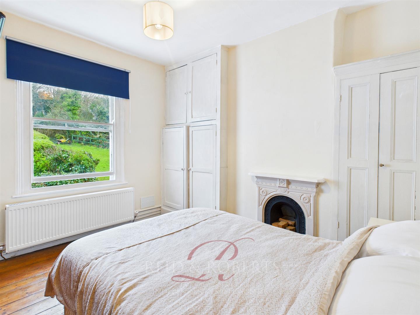 The second bedroom also boasts a decorative fireplace, built-in cupboards and wardrobes (one housing the wall-mounted boiler), and traditional wooden sash windows to the rear elevation overlooking the garden. Wooden flooring, a radiator, and generous space make this room a versatile and comfortable retreat.