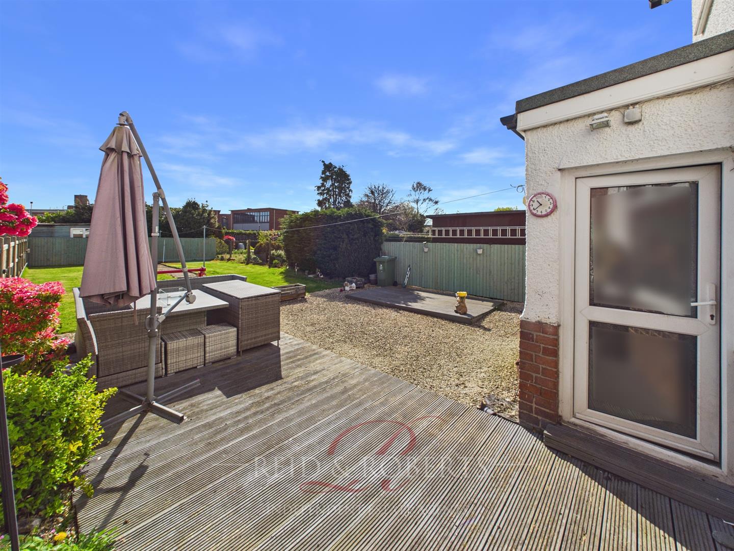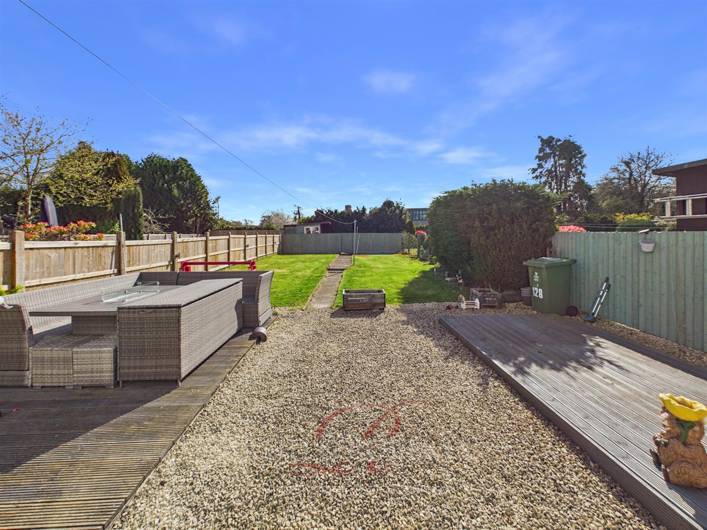 A sunny aspect garden featuring timber decking patio areas ideal for outdoor entertaining and relaxation. The remainder is a lawned garden, with paths leading to a gated storage area and a garden shed with power. Fencing and hedging enclose the garden. Outdoor tap and access to garage