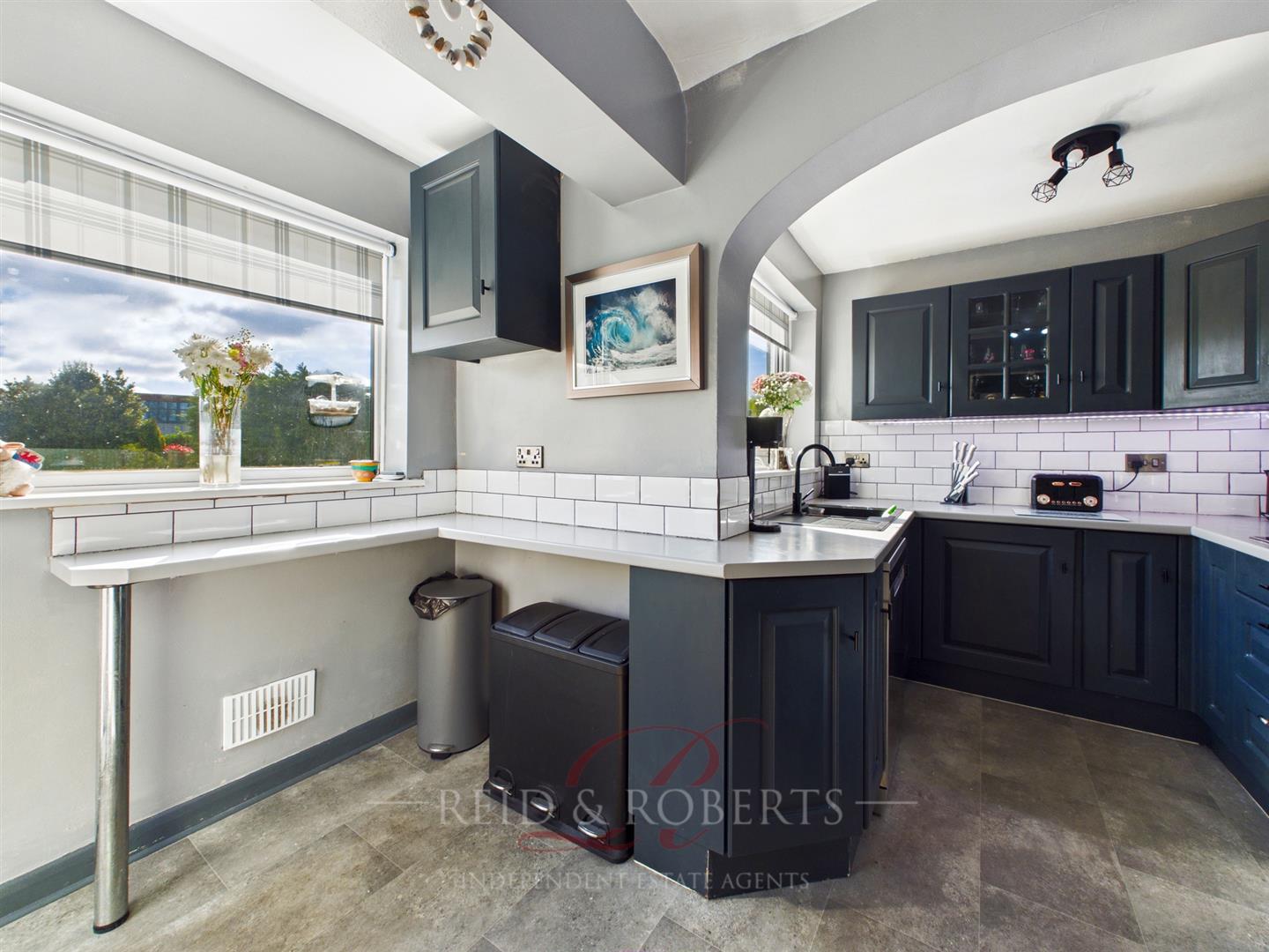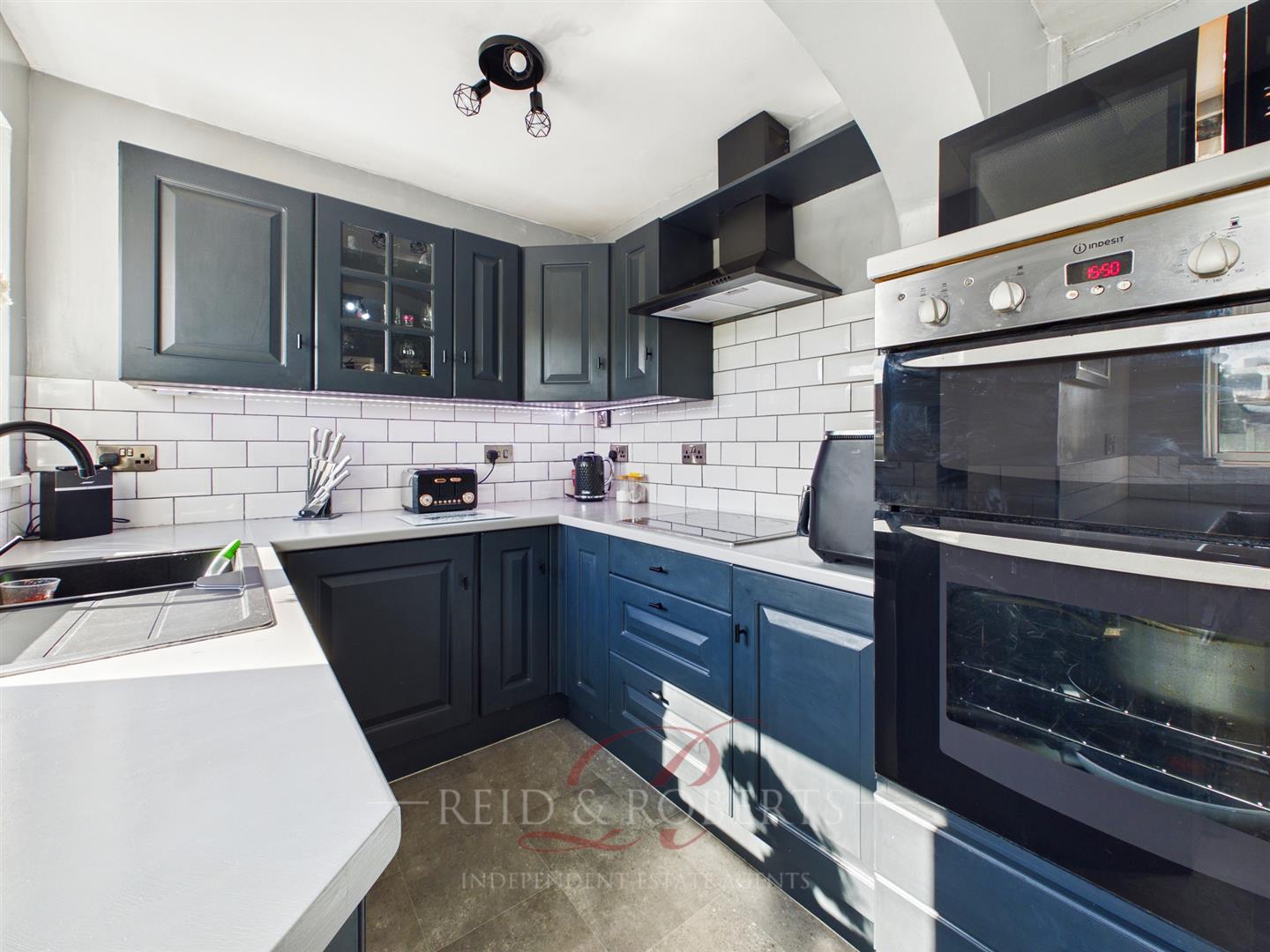 The kitchen is fitted with a range of wall, base, and drawer units with complementary work surfaces over, incorporating a composite single drainer sink unit with mixer tap over. Integrated appliances include a four ring electric hob with extractor hood and eye level double oven/grill, with space for an American style fridge freezer and plumbing for a dishwasher. The room also features a breakfast bar, part tiled walls, two UPVC double glazed window to the rear, and a UPVC part glazed external door providing access to the rear garden.