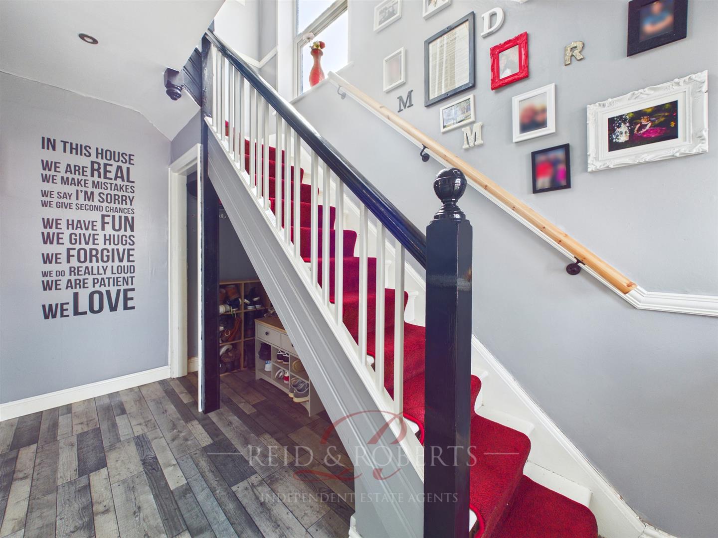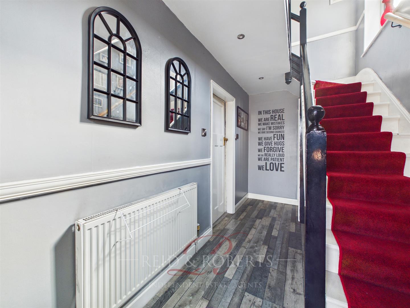 Entered via UPVC part glazed French doors, featuring tiled flooring and space for coats and shoes. A further door leads into the hallway with a welcoming space and stairs rising to the first floor accommodation, panelled radiator, and useful understairs storage area. Doors lead to the lounge/diner.
