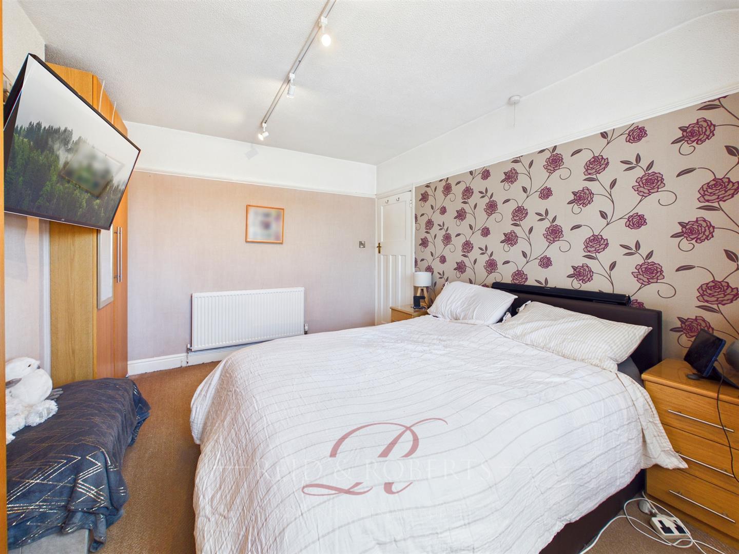 A generous double bedroom with UPVC double glazed bay window to the front elevation, television point, carpeted flooring, panelled radiator, and picture rail, offering a bright and airy space.