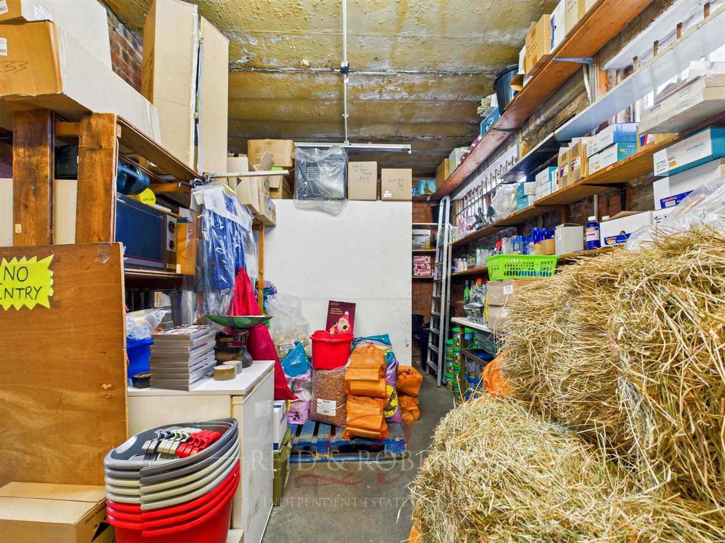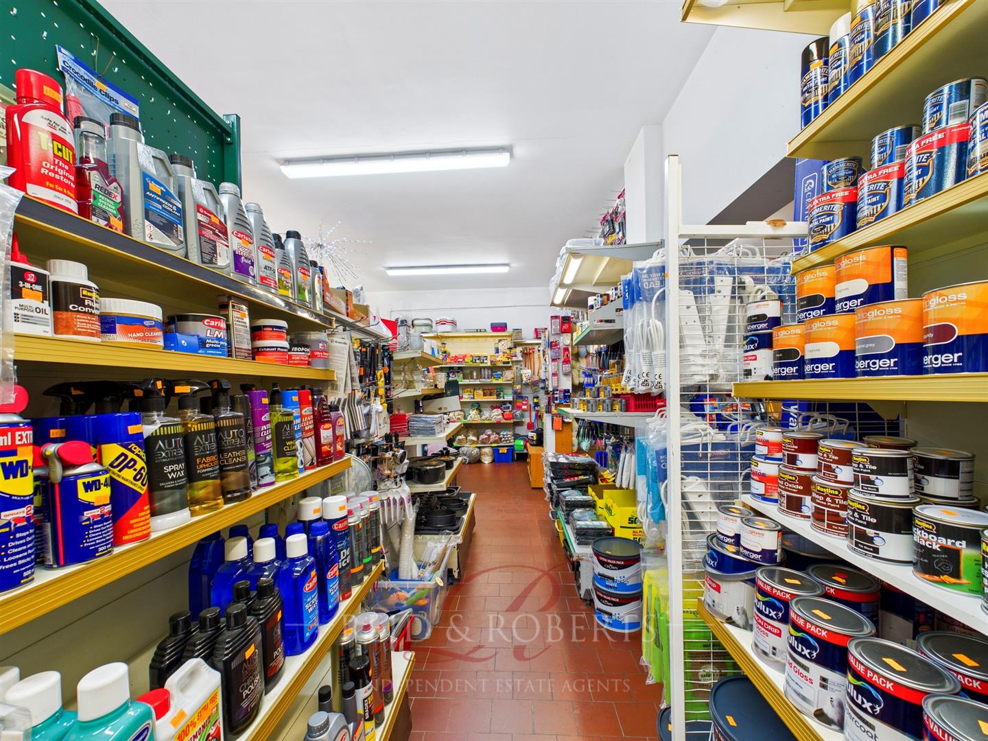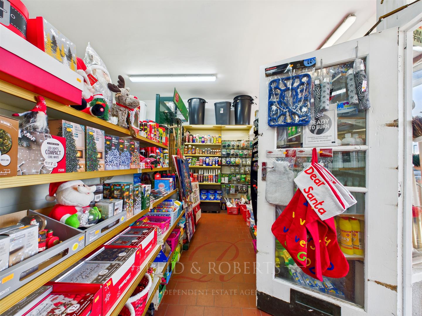 The entrance opens into a bright and spacious retail area, finished with durable quarry-tiled flooring that provides both practicality and a traditional commercial feel. The space benefits from fluorescent strip lighting throughout, ensuring a consistently well-lit environment ideal for product display. Extensive shelving lines the walls and central areas, creating an organised and efficient retail layout that accommodates the wide variety of stock the business is known for. The two large shopfront windows not only enhance visibility from outside but also bathe the retail floor in natural light during the day, giving the shop a warm and inviting atmosphere. The front counter is positioned to serve as a central point of customer interaction and is currently equipped for key-cutting services, pet supply sales, and general hardware transactions. The overall feel of the room is that of a bustling, well-stocked general store with the charm and familiarity of a long-standing local business.