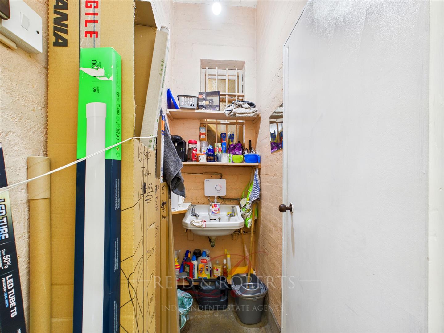 A door off the inner retail area leads into a compact staff wash area, set up with a wall-mounted wash hand basin and hot water tap. This space also accommodates shelving suitable for storing tea, coffee, and general staff amenities, offering a practical and private area for brief breaks or basic cleaning tasks. The room feels functional and thoughtfully arranged, providing essential staff facilities without encroaching on the main retail areas.