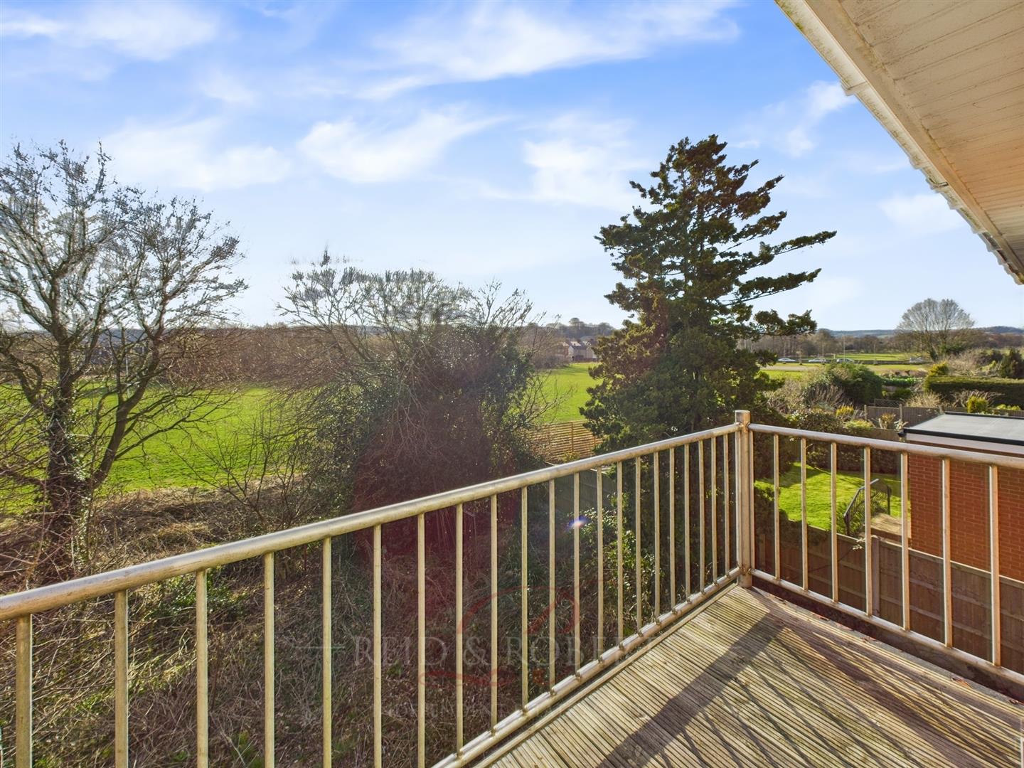 The property boasts a private balcony with wooden decking and stainless steel railings, offering stunning views of the surrounding countryside and rugby fields. The front and rear gardens provide ample outdoor space, perfect for relaxing, gardening, or outdoor entertaining. Off-road parking and a side entrance add further convenience, making this home as practical as it is charming.