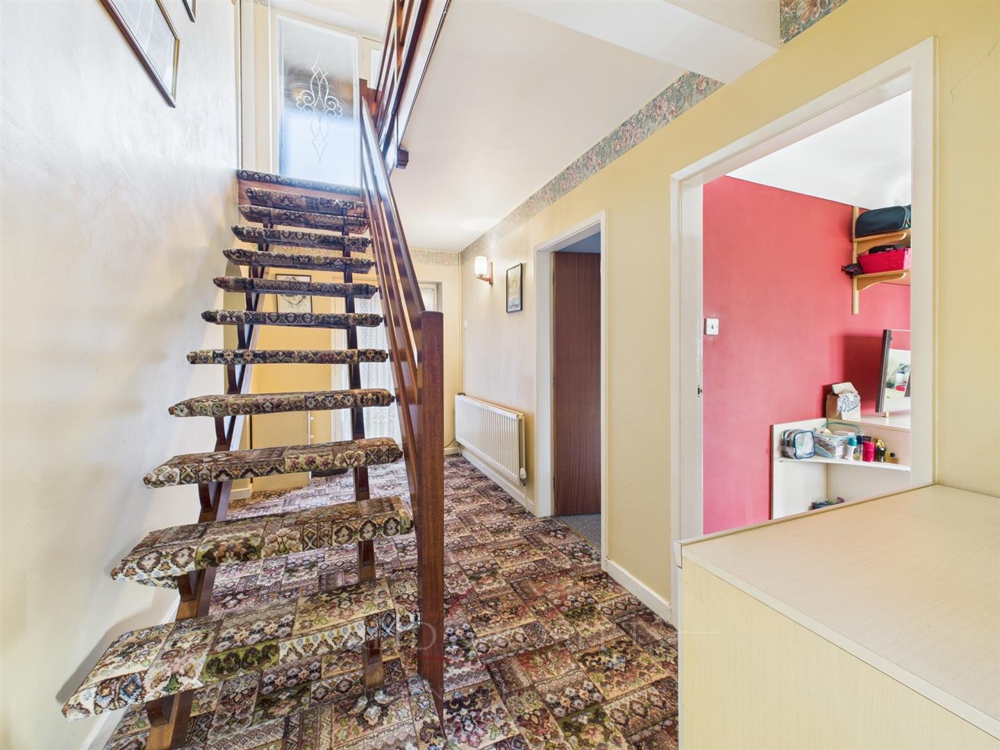 Enter a bright and airy hallway. The space is warm and inviting, with a coved ceiling, central ceiling light, and a single-panel radiator providing comfort. A staircase leads down to the bedroom accommodation, while doors open to the lounge and the expansive open-plan kitchen and dining area. A wall-mounted alarm system and smoke alarm add security and peace of mind. Doors lead to: