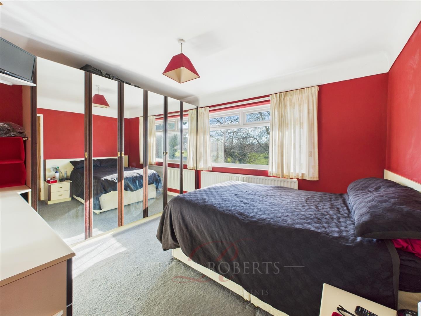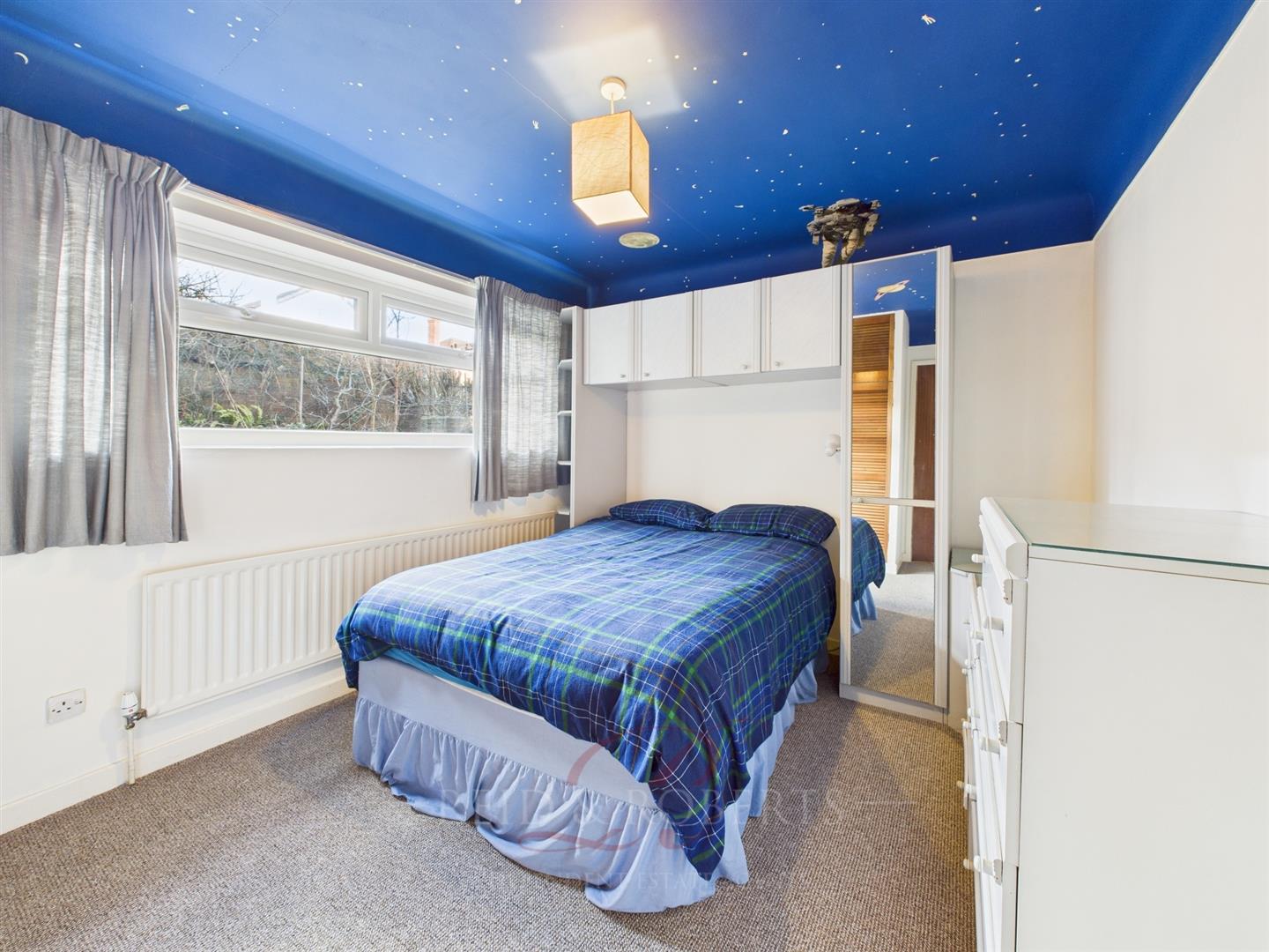 The master bedroom is a well-appointed and spacious retreat, offering both comfort and practicality. A built-in wardrobe with mirrored doors provides ample storage space, while a matching dressing table with drawers, a fitted mirror, and matching bedside tables with a headboard add to the cohesive design. The double-glazed uPVC window, complete with top openers and a tiled sill, frames picturesque views of the rear garden and the rugby fields beyond, making this a peaceful place to wake up each morning. A single-panelled radiator keeps the room warm, while a central ceiling light and coved ceiling complete the space.