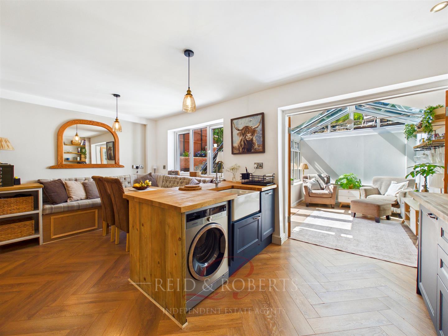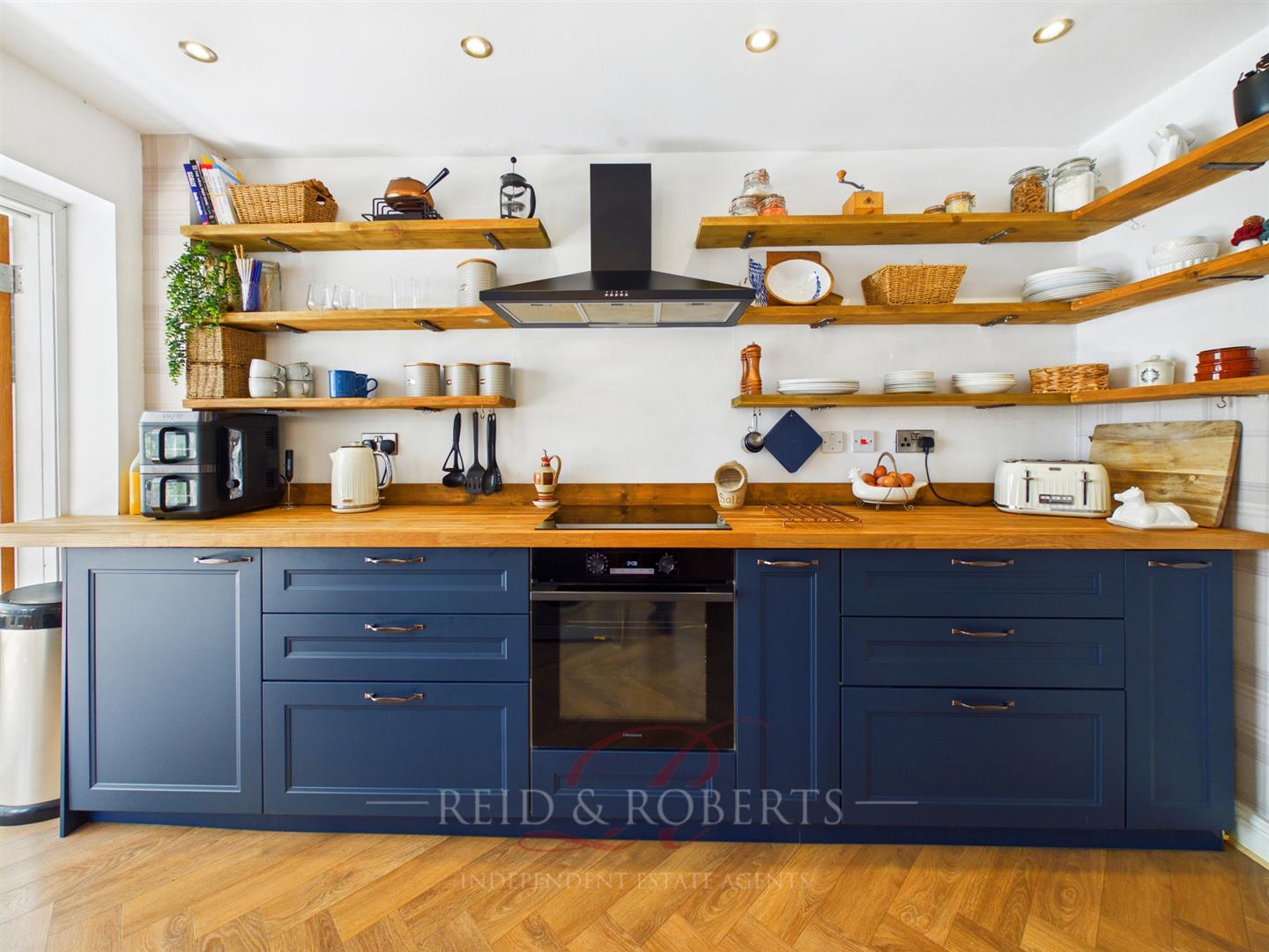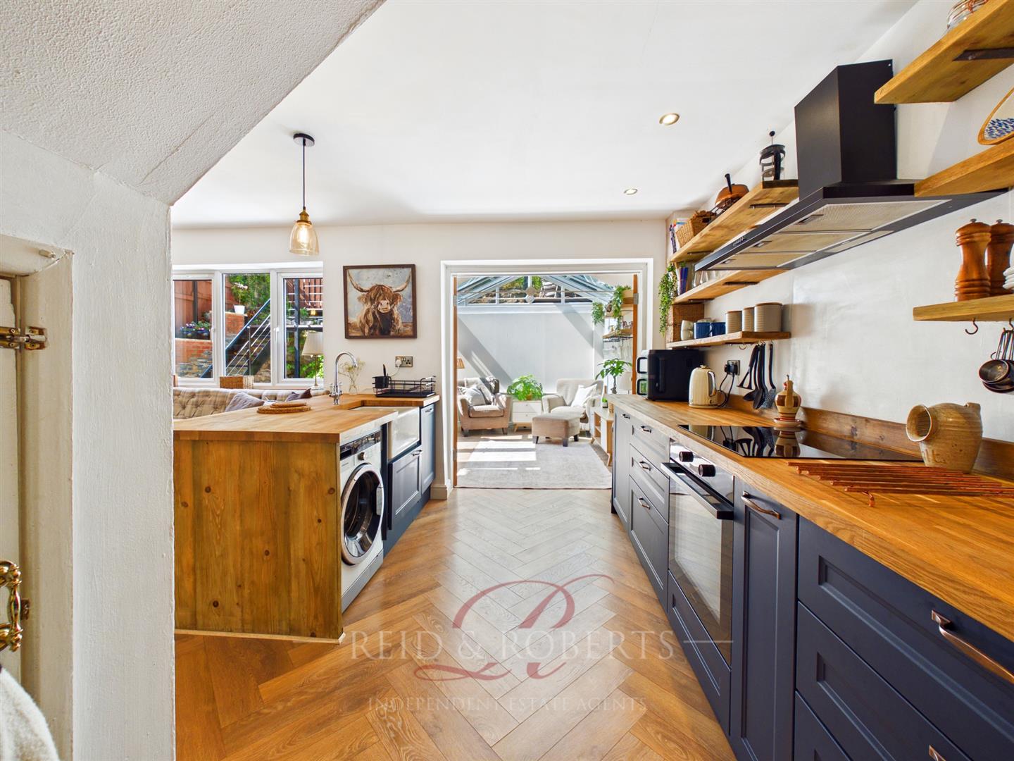 Seamlessly flowing from an opening from the dining area, the recently updated kitchen forms the heart of the home and has been designed with both style and functionality in mind. A central island with breakfast bar seating provides a natural gathering point, ideal for entertaining or casual dining. Solid wooden worktops and a classic Belfast sink introduce a timeless quality, while sleek base units and open shelving offer both storage and visual appeal. Integrated appliances, including an electric oven and induction hob with extractor hood, are complemented by void and plumbing for washing machine and dishwasher. Recessed spotlighting and elegant LVT parquet-style flooring complete the space, giving it a refined and cohesive finish.