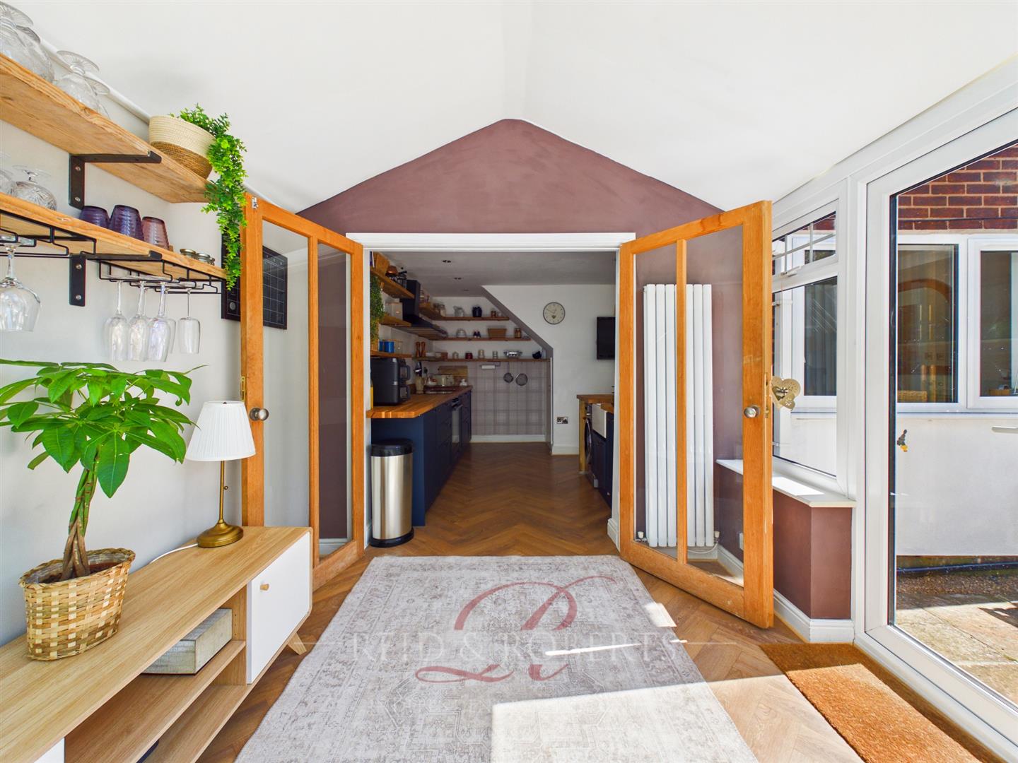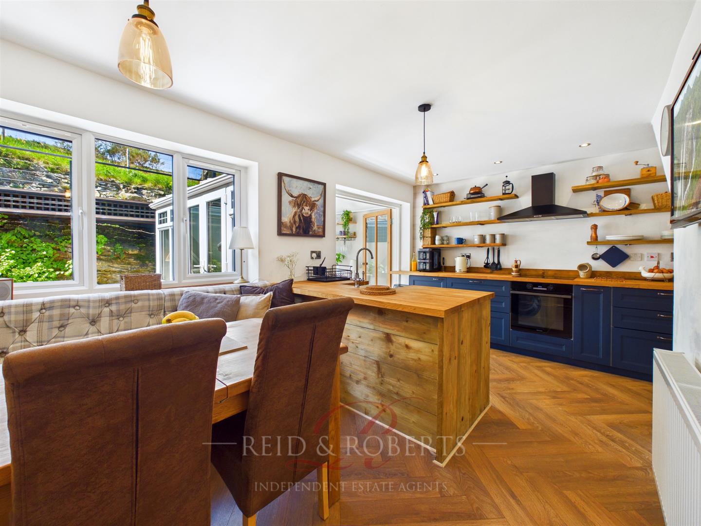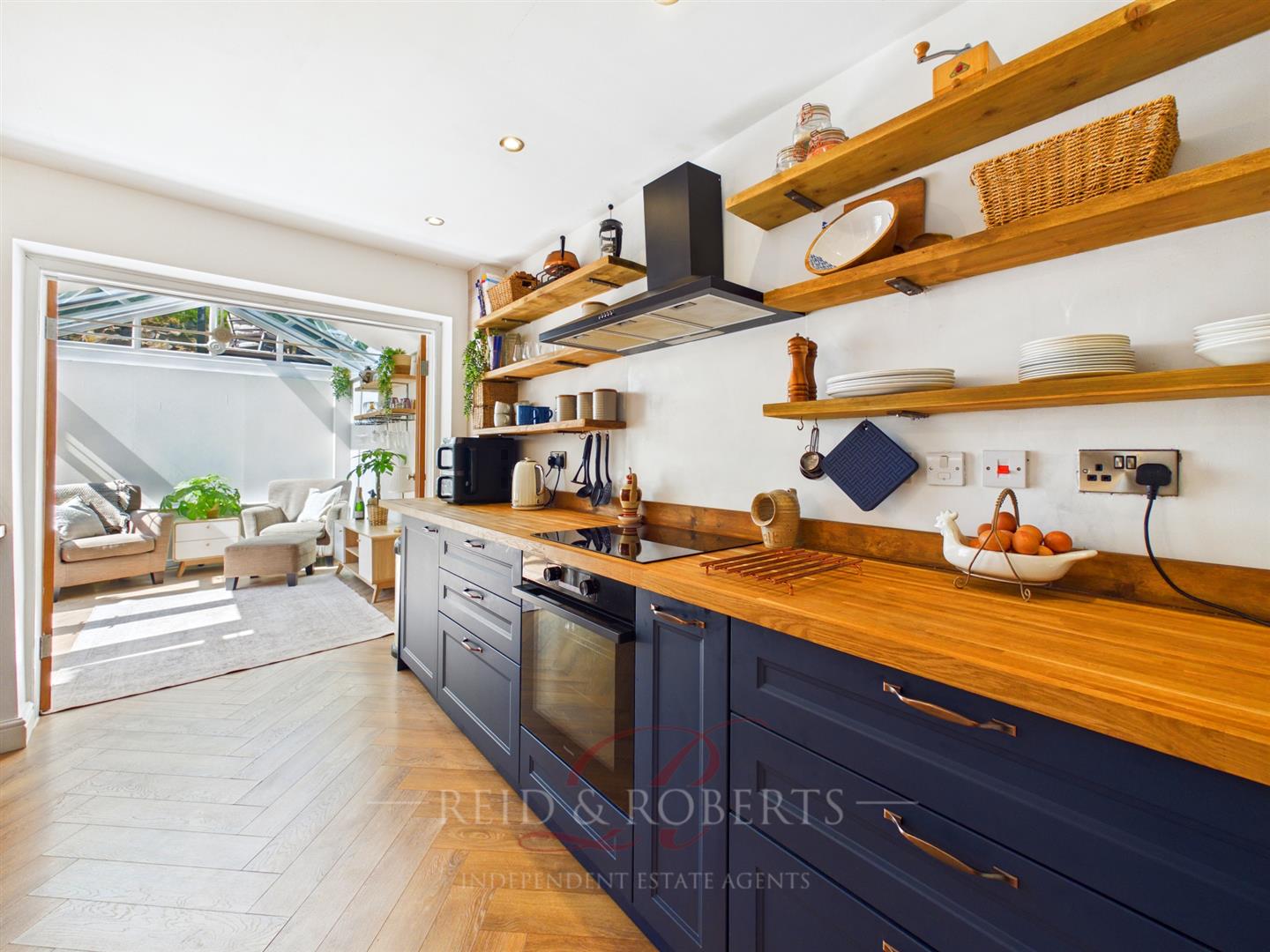 Seamlessly flowing from an opening from the dining area, the recently updated kitchen forms the heart of the home and has been designed with both style and functionality in mind. A central island with breakfast bar seating provides a natural gathering point, ideal for entertaining or casual dining. Solid wooden worktops and a classic Belfast sink introduce a timeless quality, while sleek base units and open shelving offer both storage and visual appeal. Integrated appliances, including an electric oven and induction hob with extractor hood, are complemented by void and plumbing for washing machine and dishwasher. Recessed spotlighting and elegant LVT parquet-style flooring complete the space, giving it a refined and cohesive finish.