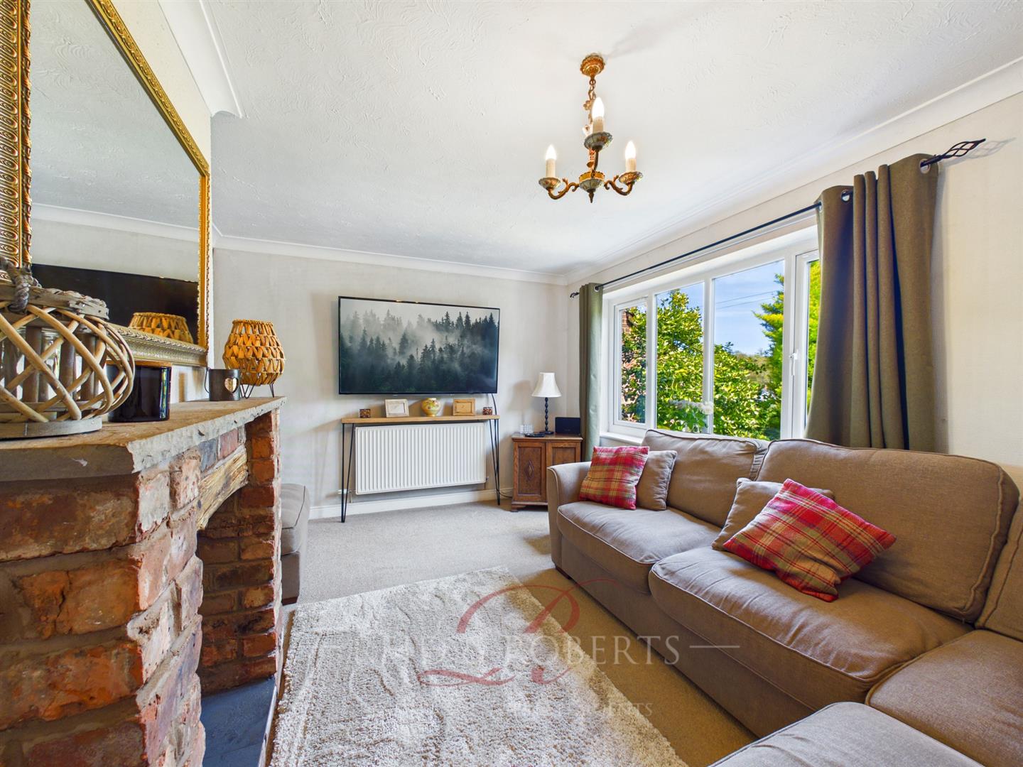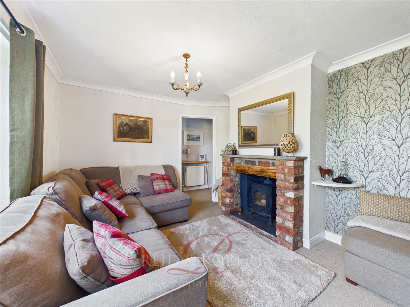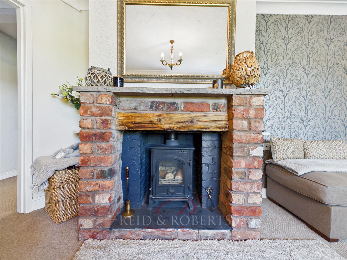 A welcoming and well-presented living room, the space features a charming exposed brick fireplace with a wood-burning stove, creating a cosy focal point. A large front-facing Upvc window allows plenty of natural light.