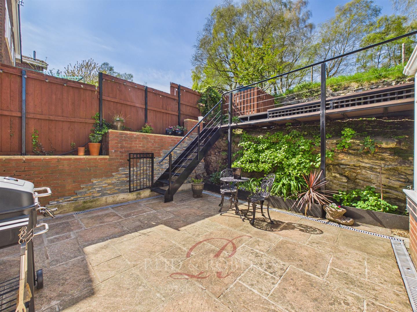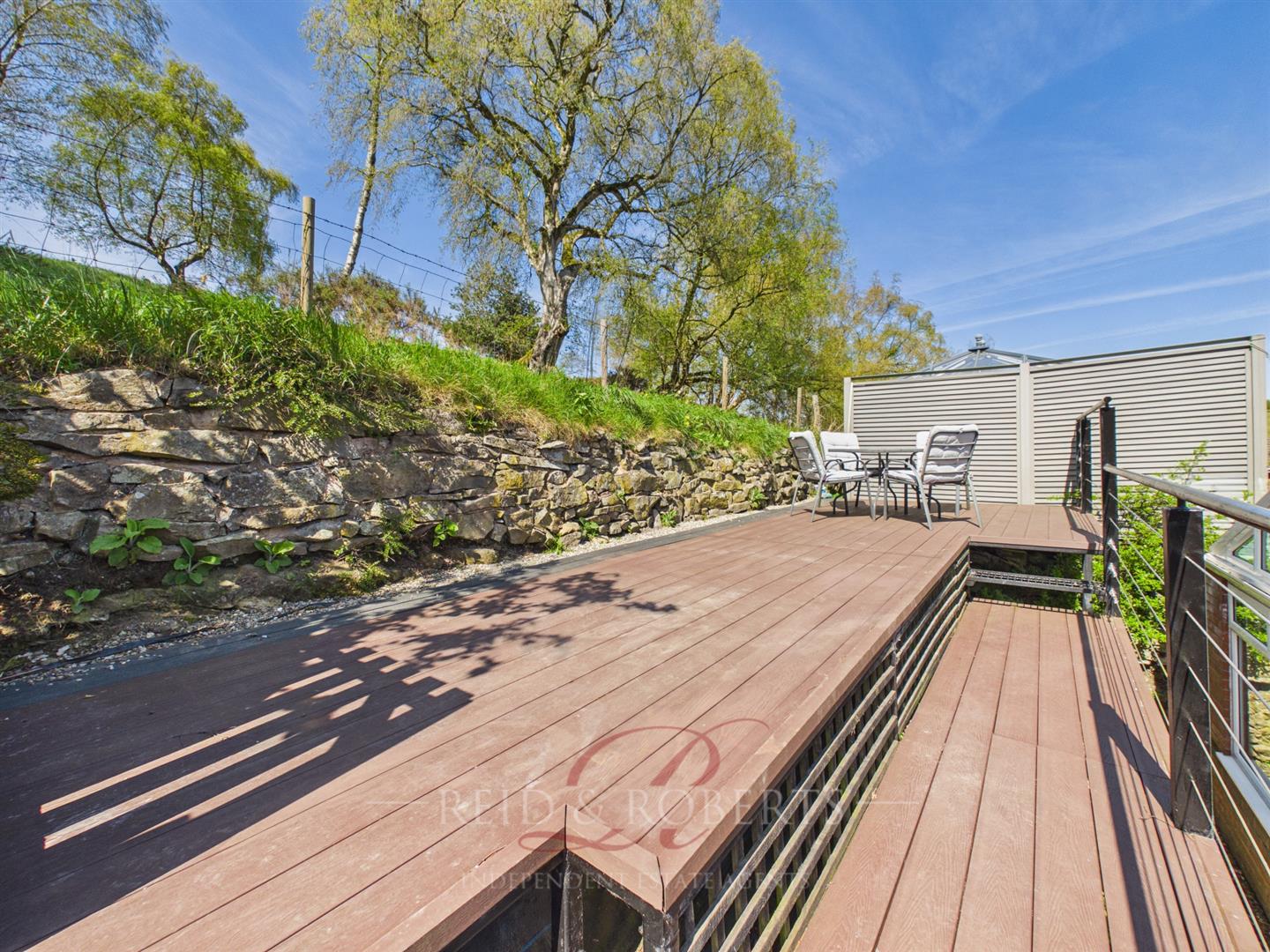 The rear garden has been thoughtfully arranged across two levels, offering a blend of functionality and tranquillity. A block-paved patio extends directly from the conservatory, providing the perfect setting for outdoor dining and summer gatherings, bordered by a variety of established shrubs and planting. From here, steps lead to an elevated decking area that enjoys a sunny aspect and open views across surrounding farmland. This peaceful and private setting creates a wonderful retreat, ideal for enjoying quiet mornings or unwinding in the evening.