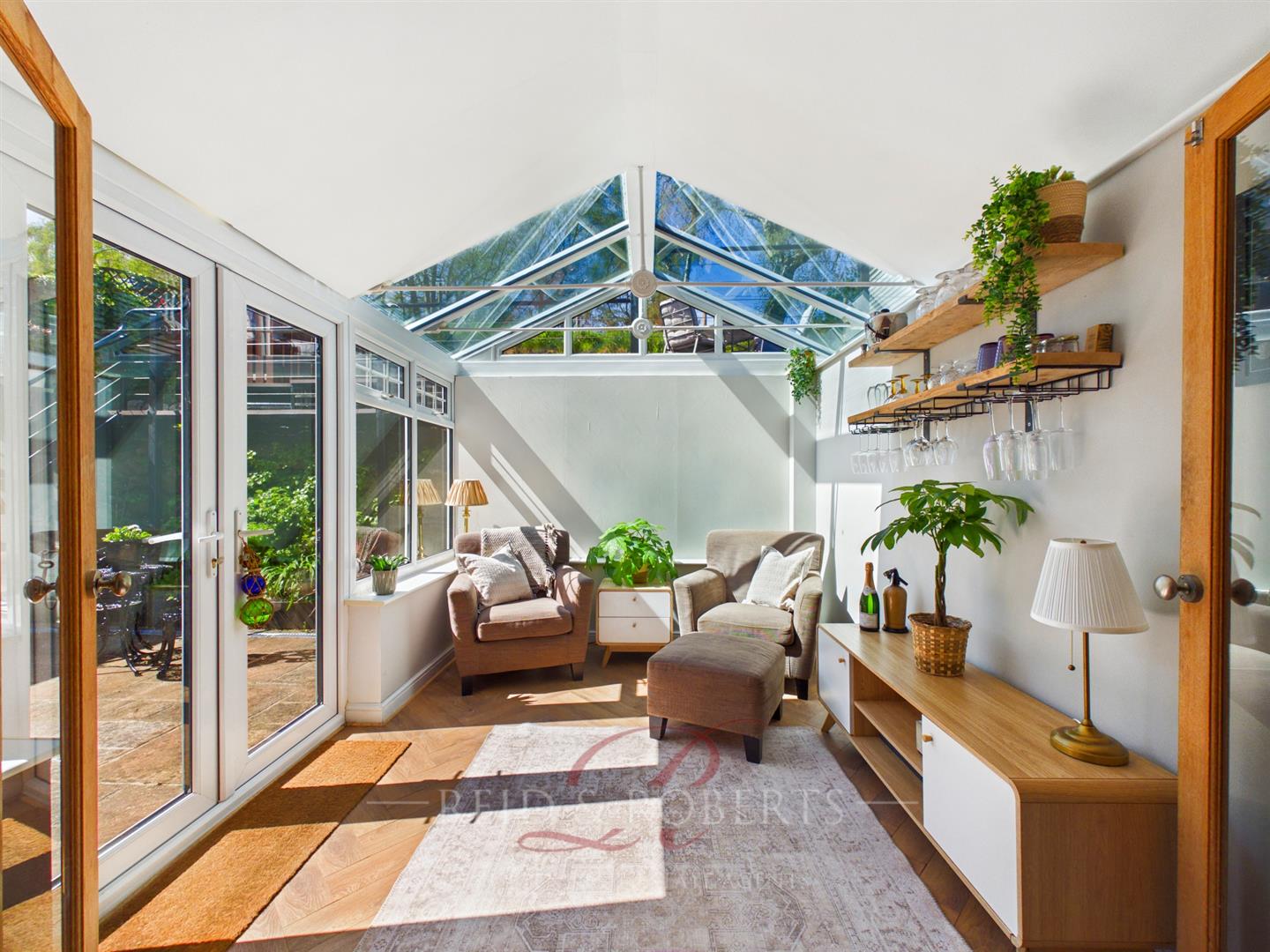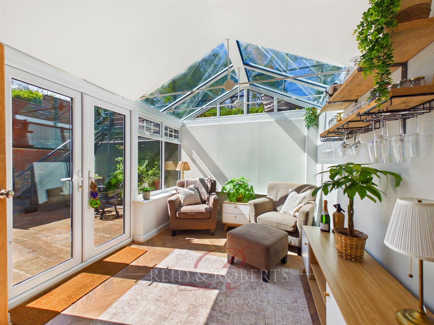 Flowing effortlessly from the kitchen, the conservatory is a standout feature of the home and a truly exceptional addition. Designed with a partially solid roof alongside glazed sections, it achieves a perfect balance of brightness and year-round comfort. Surrounded by Upvc windows set upon a dwarf brick wall, the space is filled with natural light and offers peaceful views across the garden. Patio doors provide direct access outside, creating a seamless connection between indoor and outdoor living, and making this an ideal space for both relaxation and entertaining.