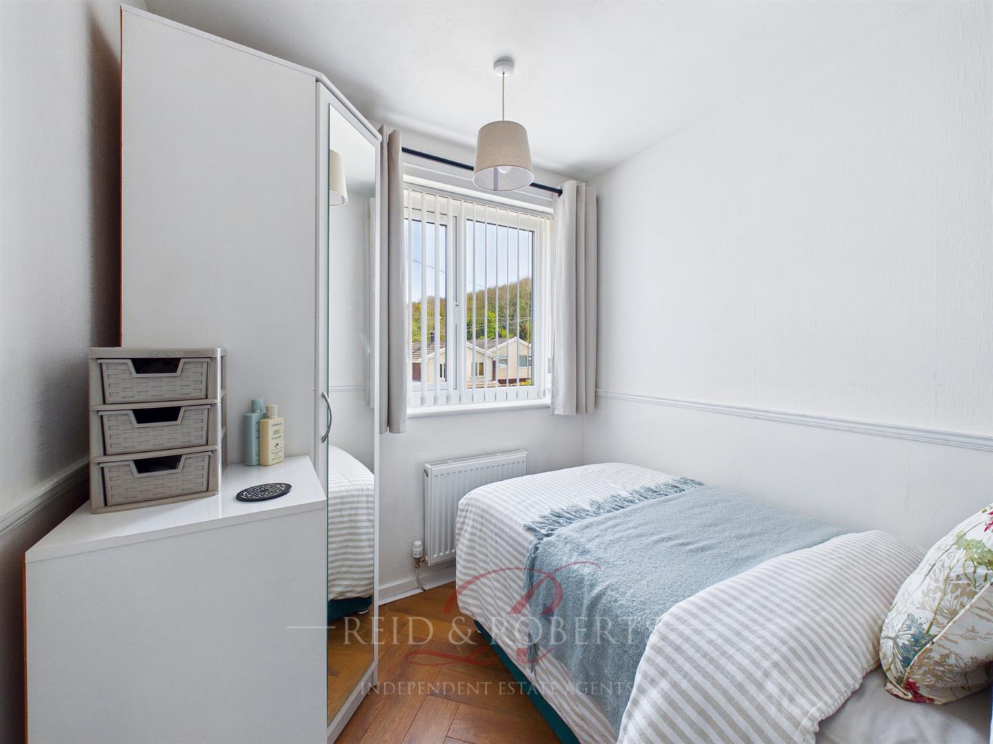 Bedroom three is a single bedroom featuring a front-facing Upvc window with side opener allowing plenty of natural light. The room benefits from a double panel radiator and a textured ceiling, and offers ample space for a corner wardrobe, making it a versatile room that is ready for immediate use.