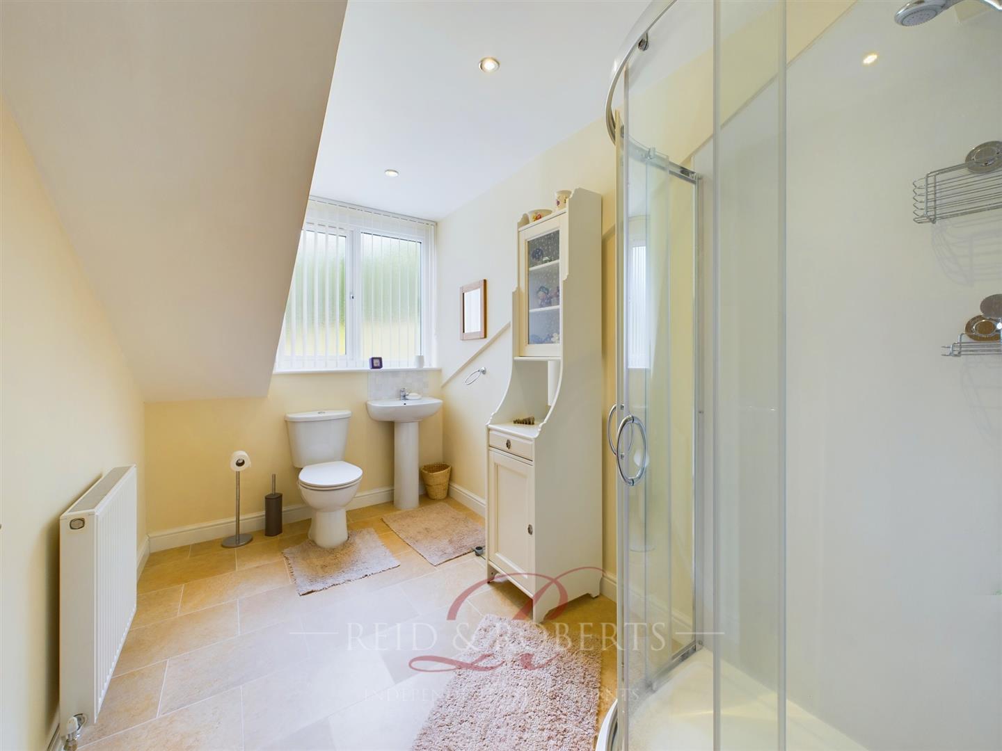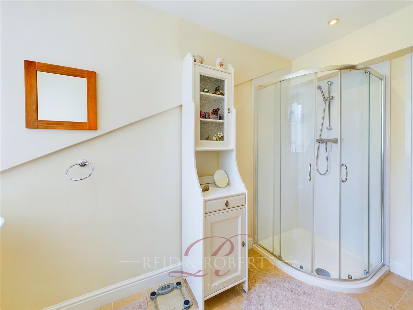 Modern fitted Shower room comprising of a three piece suite with corner shower cubicle with mains shower head attachment, wash hand basin with mixer tap over, low level flush, recessed spotlighting and tiled effect vinyl flooring, upvc splash back panelling, double panelled radiator. Upvc double glazed frosted window to the rear elevation.