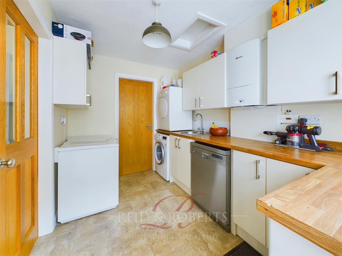 Modern fitted cream wall, base and drawer units with wooden worktop over, stainless steel sink with mixer tap over, void and plumbing for washing machine and dishwasher, wall mounted 'Worcester' boiler, tiled effect vinyl flooring continues from the kitchen and into the Downstairs cloakroom. Upvc door with frosted window and upvc double glazed window to the side elevation.
