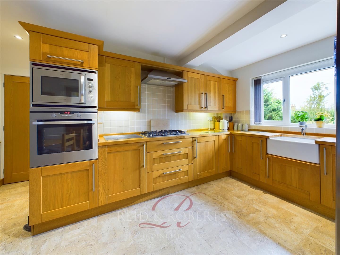 A modern fitted kitchen housing a range of wooden wall, base and drawer units and matching worktops with a feature belfast sink with mixer tap over and overlooking the stunning gardens. Integrated eye level oven and microwave, five ring gas rob with extractor fan over. Splash back tiling, tiled effect vinyl flooring and recessed spotlights. Space for free standing fridge/freezer.