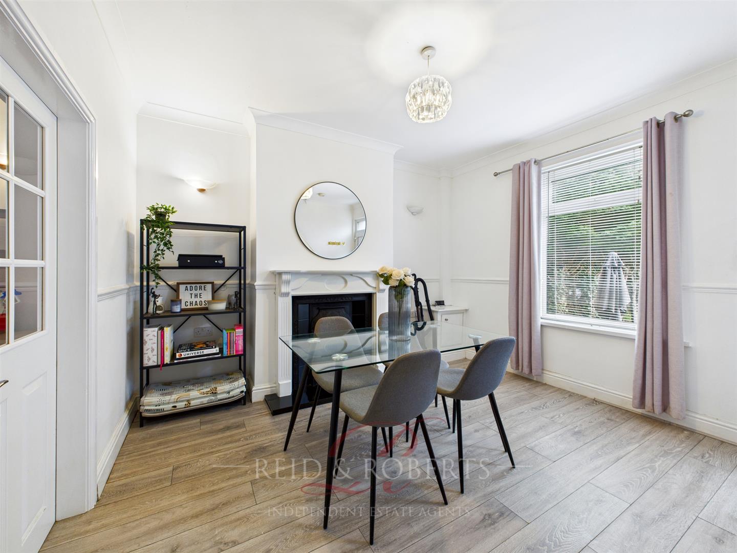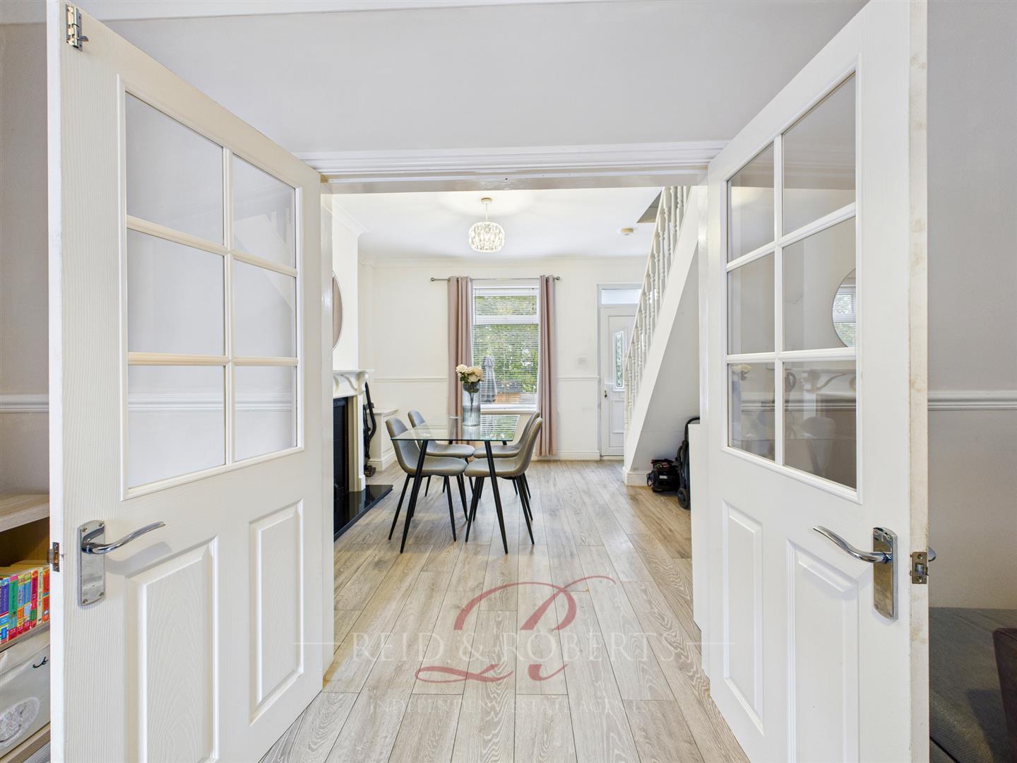 A bright and airy space with wood-effect laminate flooring, The room features a charming traditional cast iron fireplace with ornate detailing, set within a white surround and complemented by a polish black hearth. UPVC double glazed window to the rear elevation, stairs rising to the first-floor accommodation. Double panelled radiator, UPVC door leading to the rear garden, ceiling light point, and wall-mounted lights.