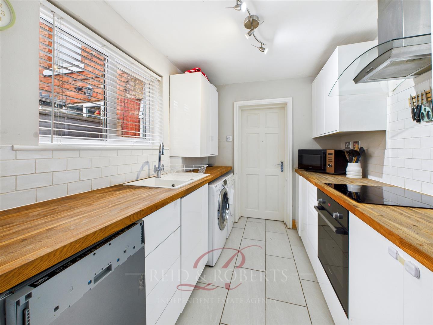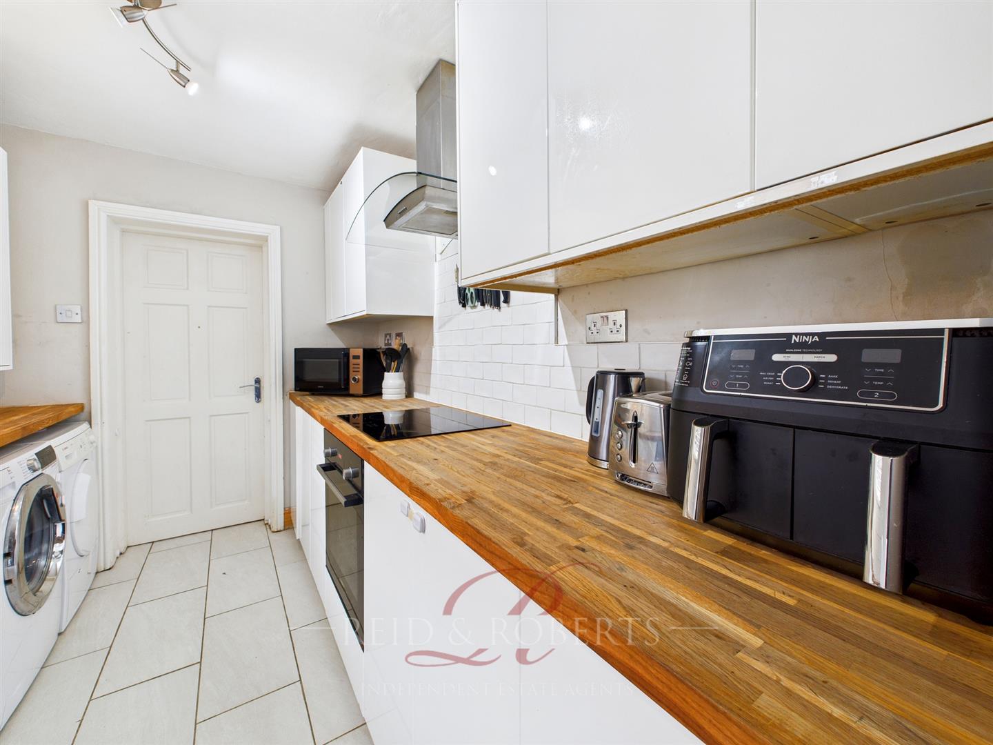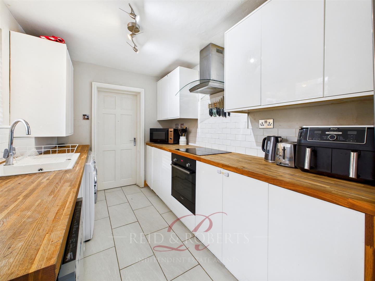 A modern fitted Kitchen offering a range of wall and base units complemented by wood-effect worktops, tiled flooring, and partially tiled walls. Includes space for a fridge/freezer, dishwasher, washing machine, and dryer. Features a composite sink with mixer tap over, UPVC double glazed window to the front elevation, integrated ‘Bosch’ oven with ‘Logic’ induction hob and extractor fan above, ceiling light point, and UPVC door to the front elevation. Door leading off to the Lounge and Downstairs Bathroom.