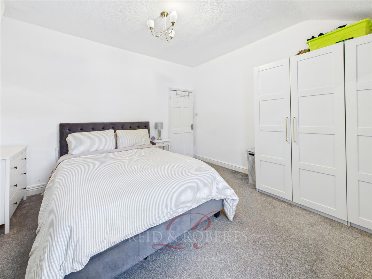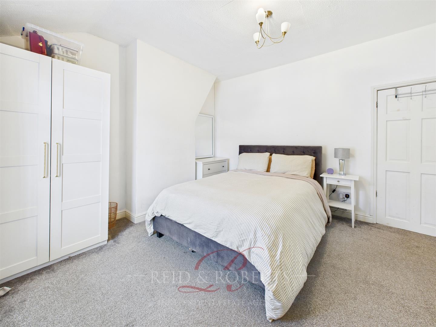 Double bedroom with carpeted flooring, built-in storage space, UPVC double glazed window to the rear elevation, ceiling light point, and single panelled radiator.