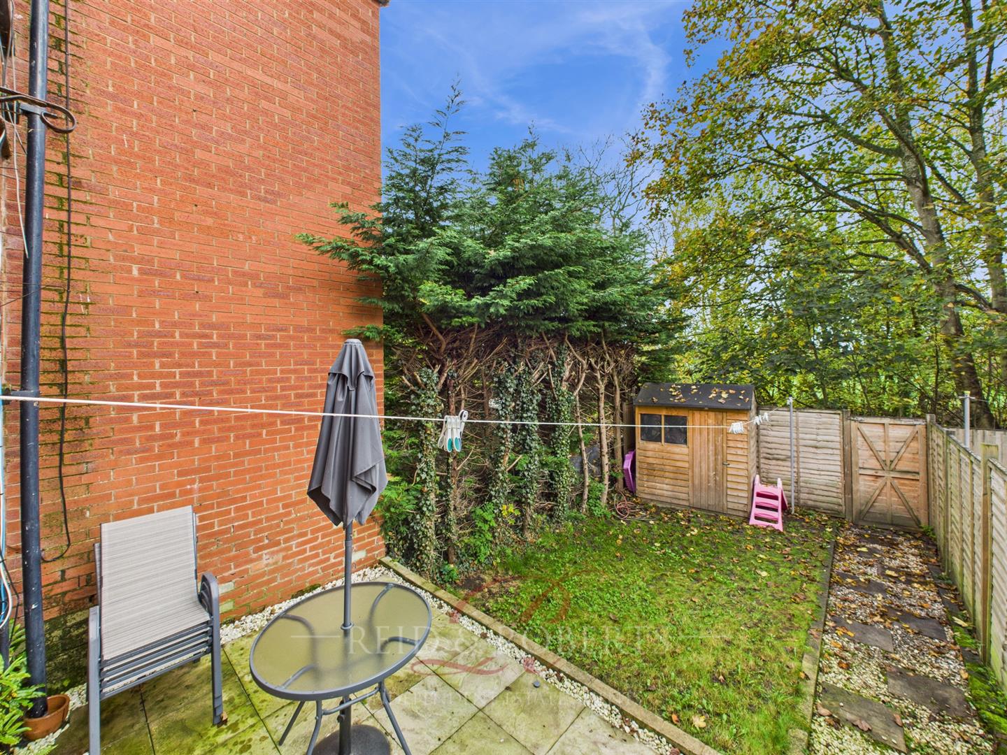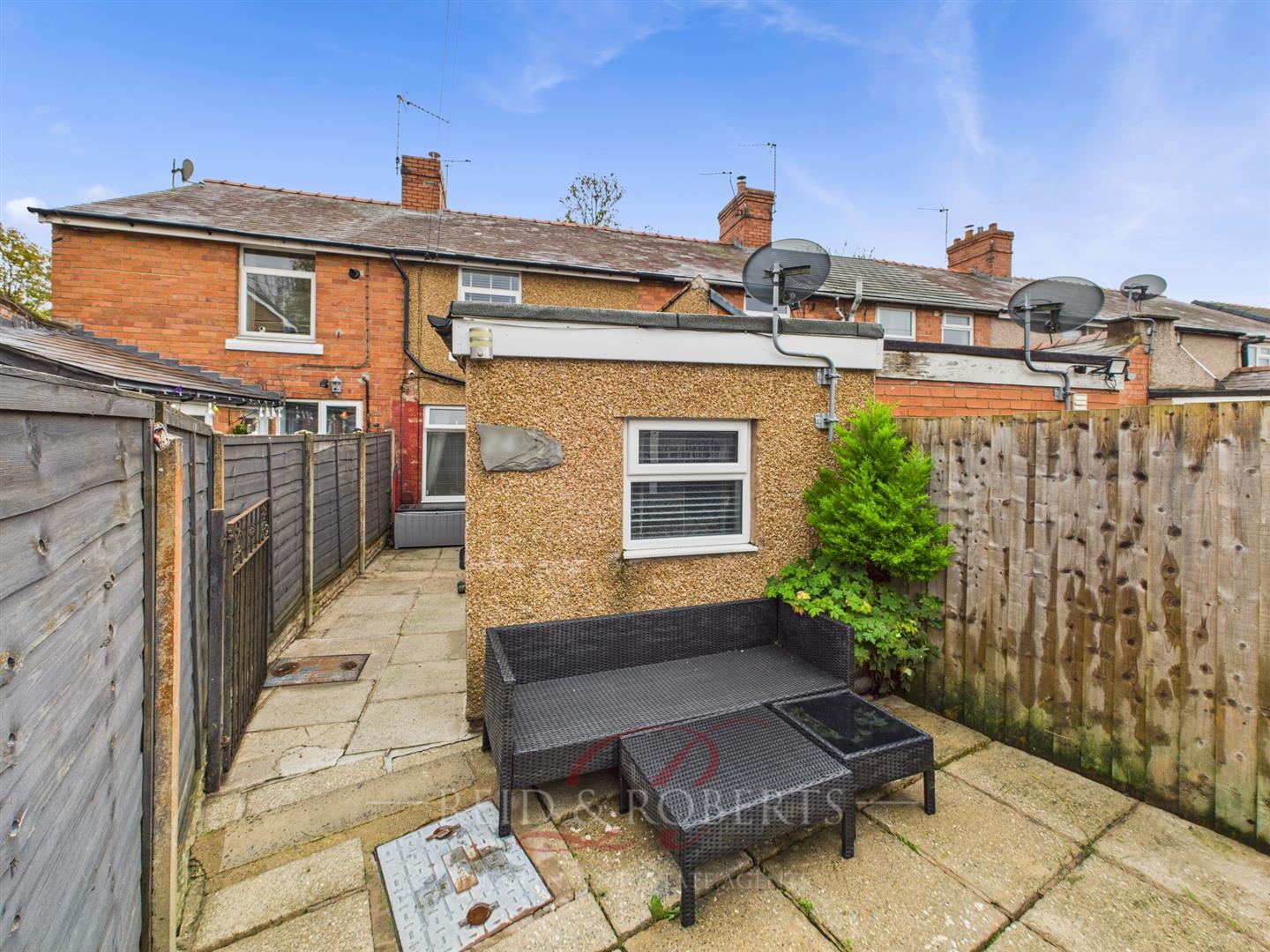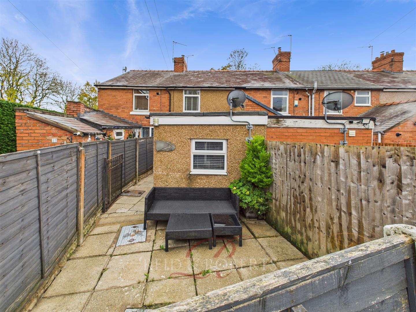 Accessed through a wooden gate, with a patio area and fenced boundary. UPVC door leading to the Kitchen and parking spaces available for two vehicles.
