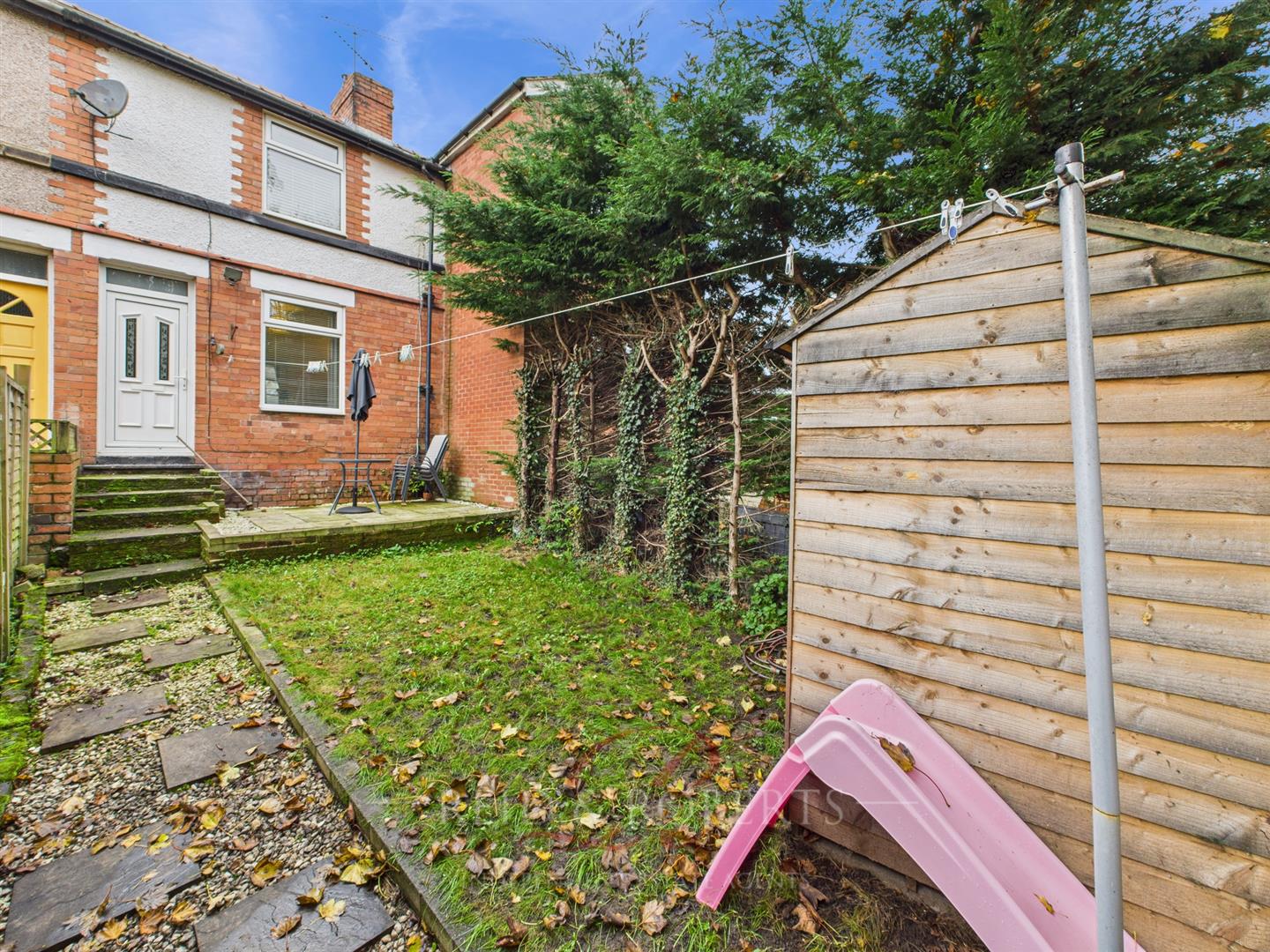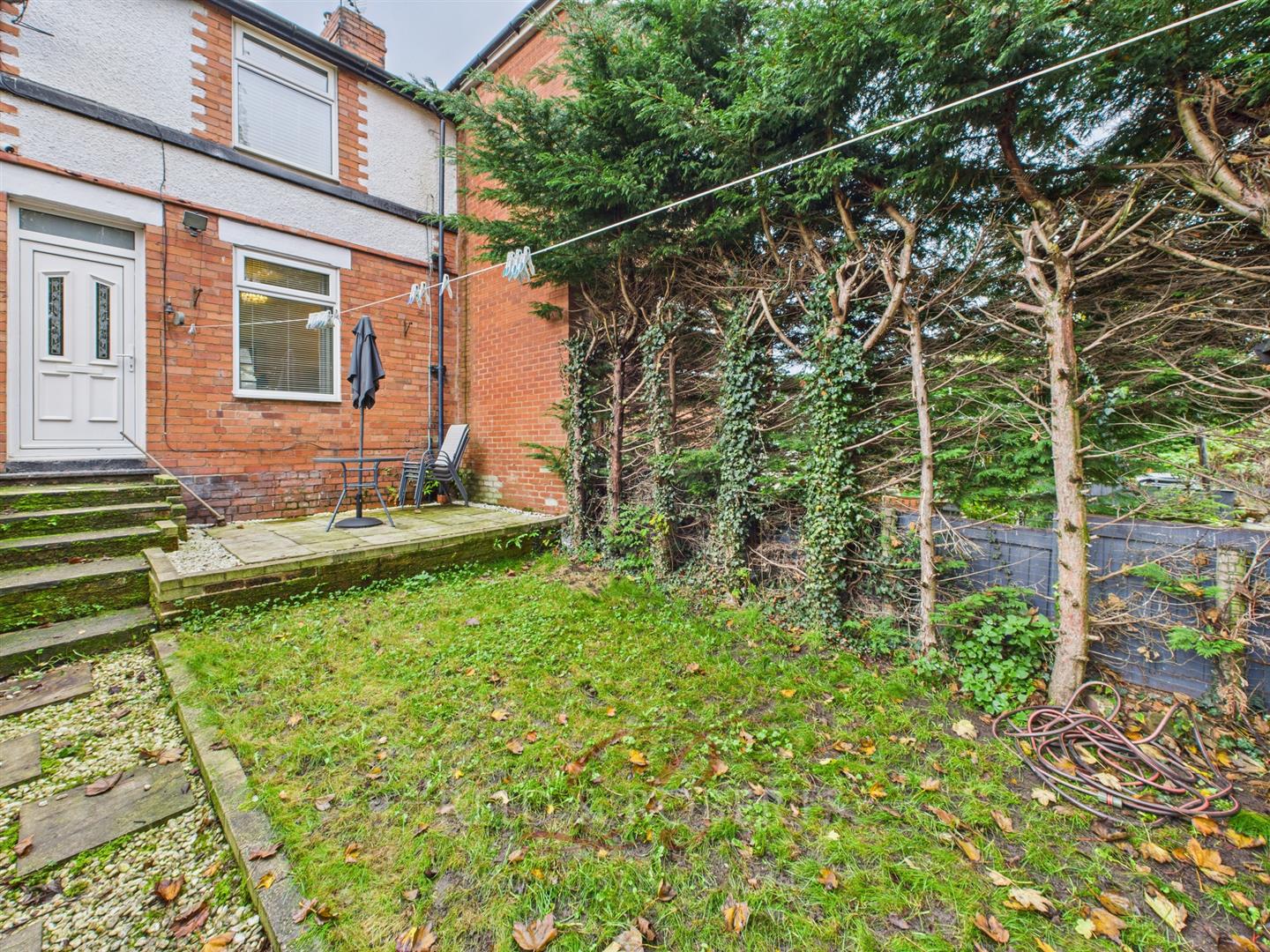 Mainly laid to lawn with a patio seating area and gravelled borders. A slate and gravel pathway leads to the gated access, enclosed by fencing and mature trees for privacy. Steps lead up to the UPVC door providing access into the property.