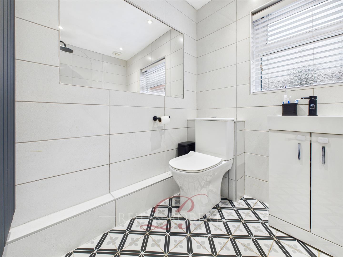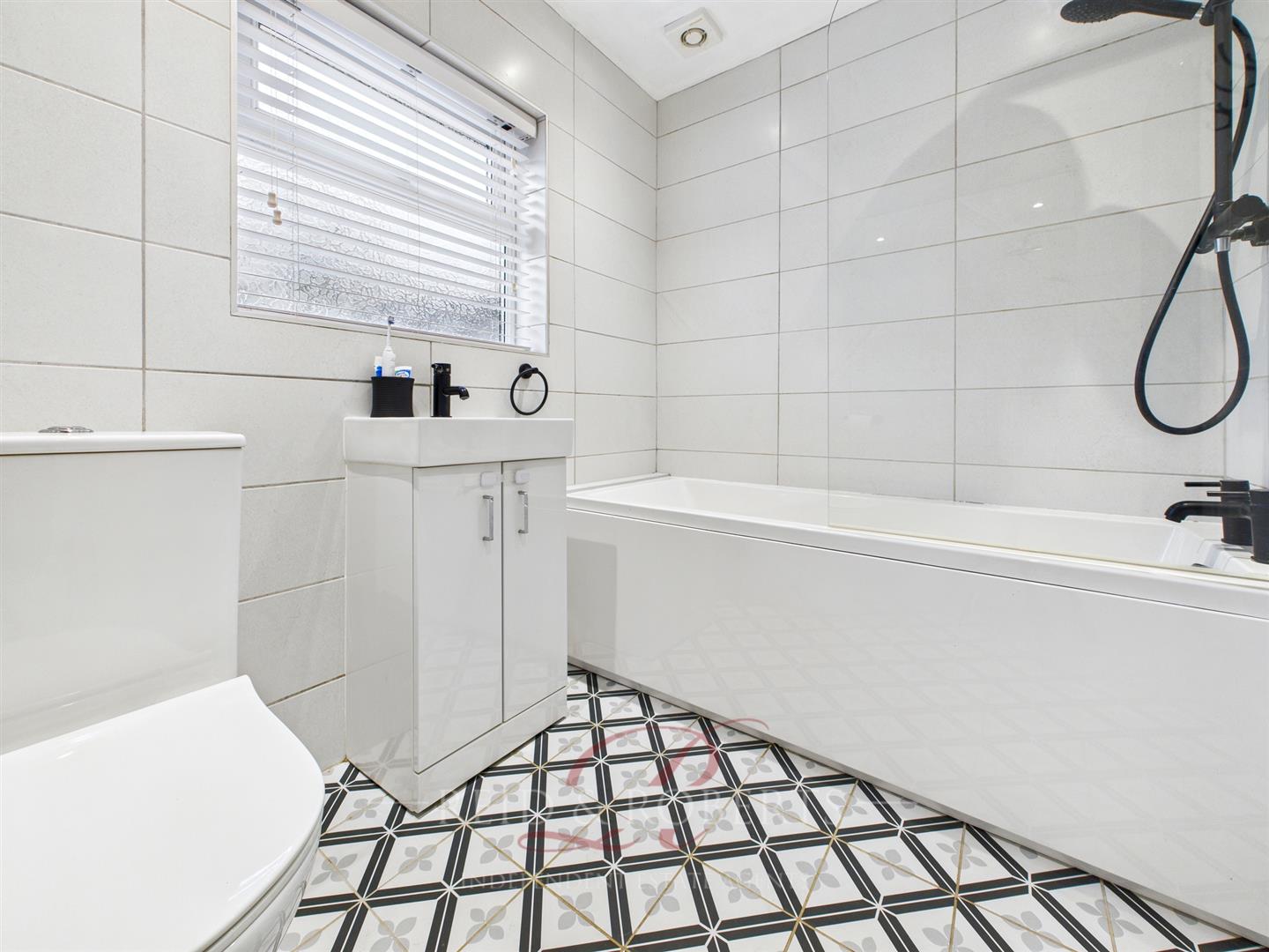 A modern Bathroom fitted with tiled flooring and fully tiled walls. Comprising a low-flush WC, wash hand basin with vanity unit, and a panelled bath with mixer tap, handheld shower attachment, and waterfall shower over. UPVC double glazed frosted window to the front elevation, wall-mounted radiator, and spotlights.