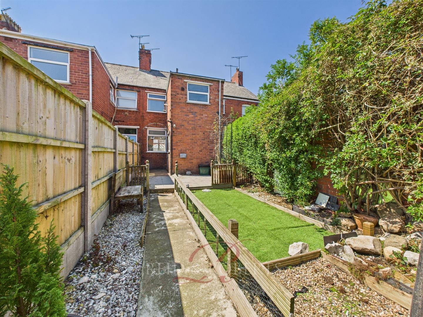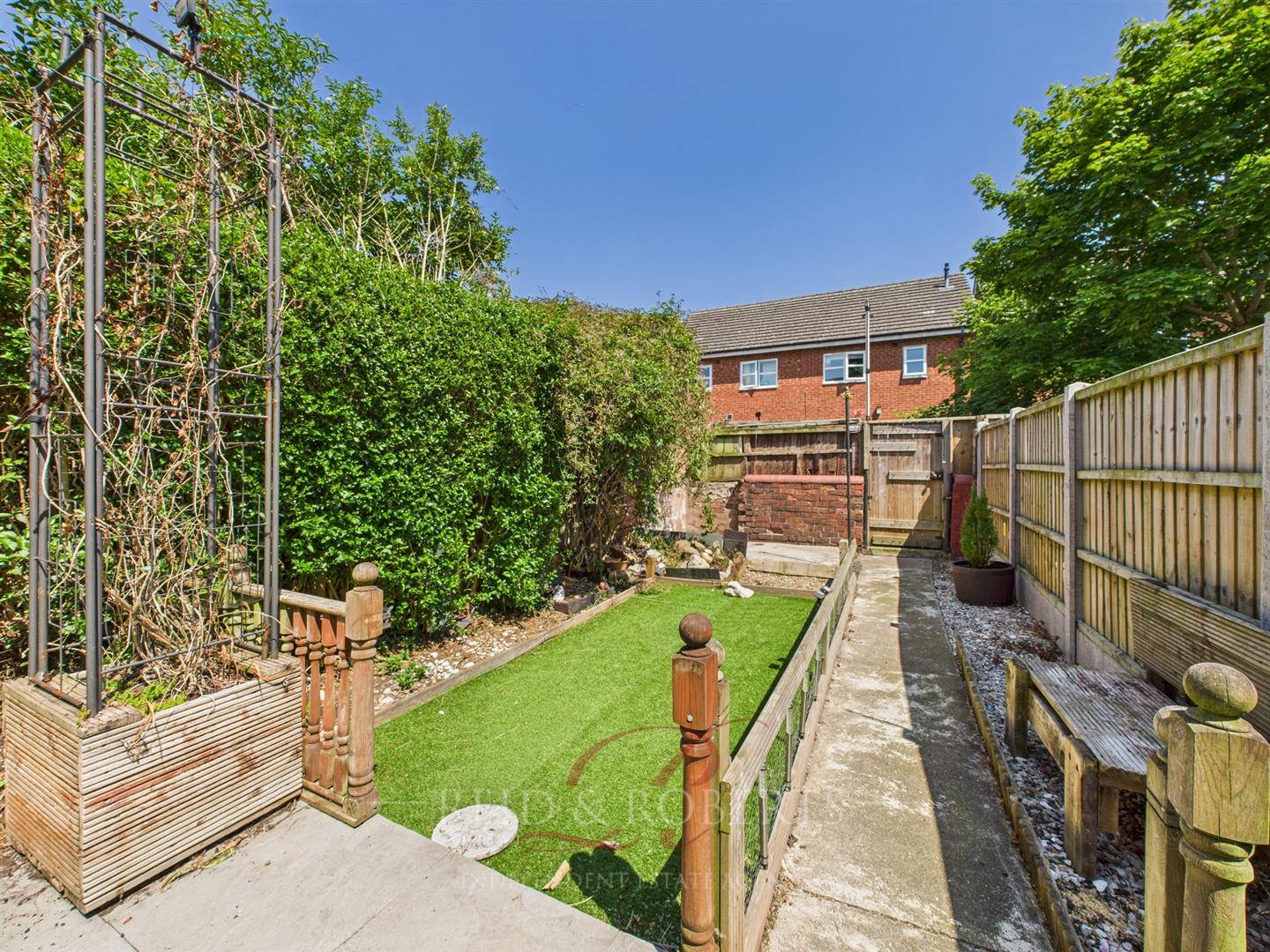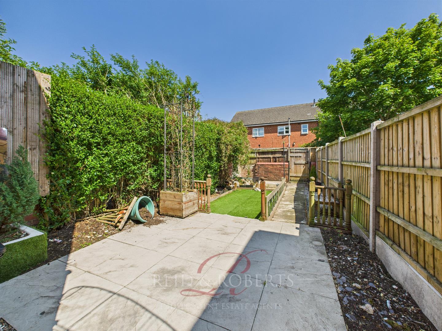 The accommodation in brief comprises: Lounge/Diner with dual aspect windows and ample living space, Fitted Kitchen with access to the rear garden, and to the First Floor: Two Bedrooms and a Family Bathroom. Externally, the property offers a low-maintenance rear garden with artificial lawn area, gravelled borders, and a shared access pathway for bins and services.