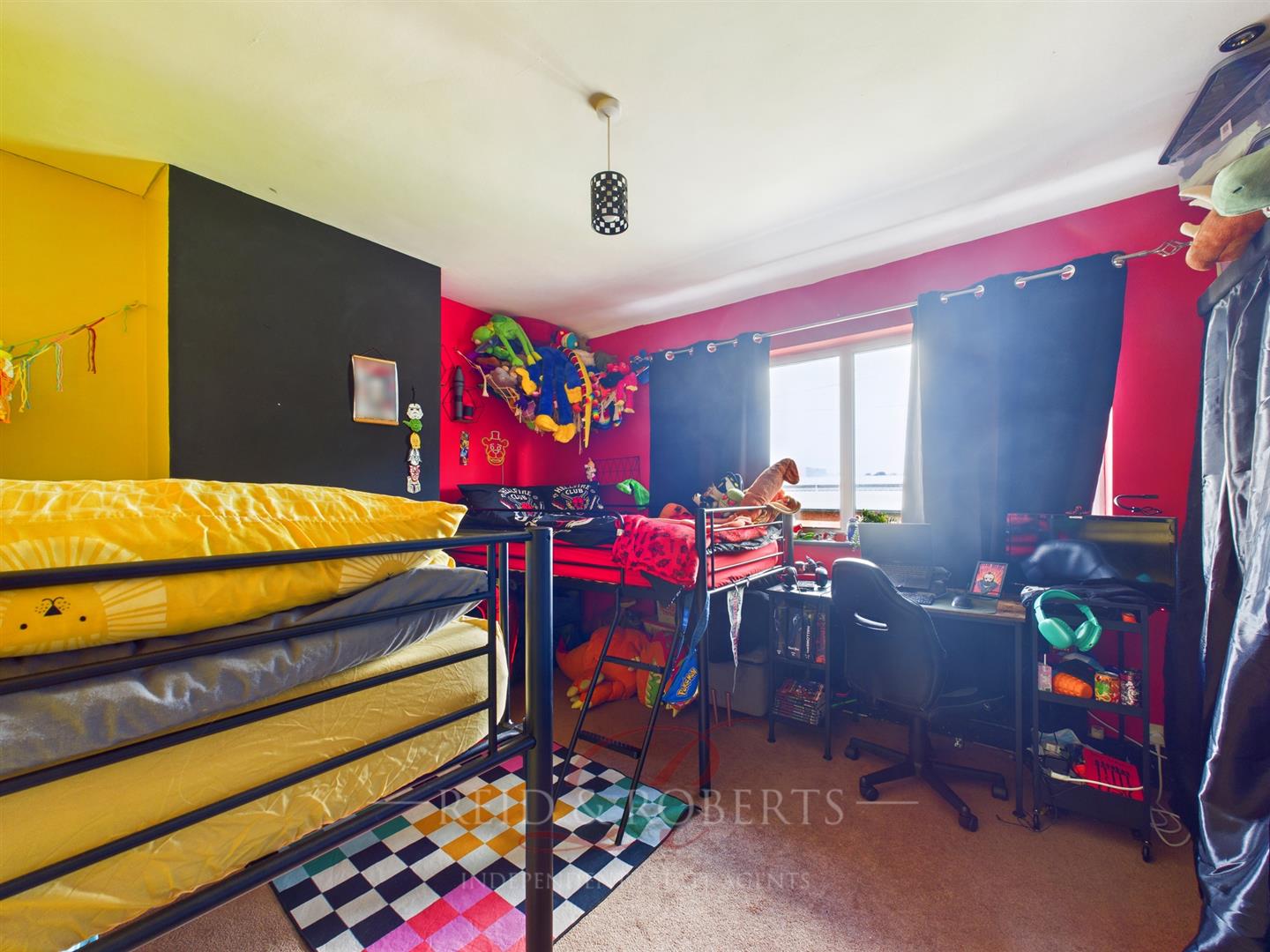 A generous double bedroom, currently arranged with twin bunk beds – showing just how spacious it really is.