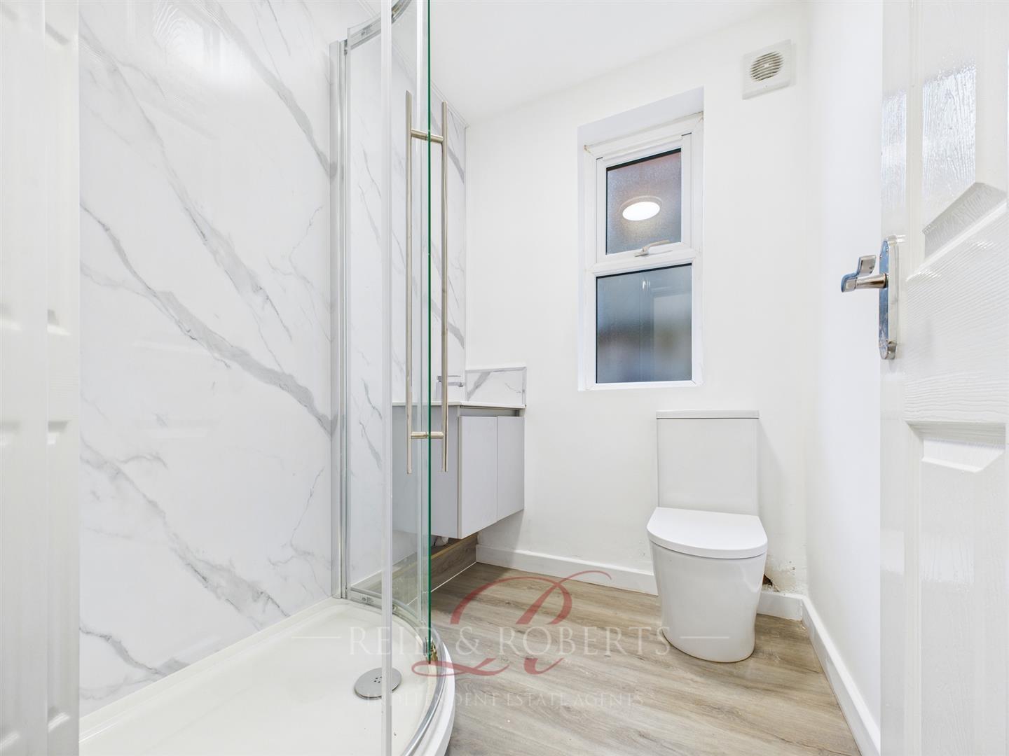 The shower room is modern and well-appointed, comprising a corner shower cubicle with both rainfall and handheld attachments, wash hand basin set within a vanity unit with soft-close storage cupboards, and a low-flush WC. The room is finished with wood-effect laminate flooring, marble-effect wall tiling to one wall, extractor fan, heated towel rai, frosted uPVC double glazed window with top opener, and a central ceiling light point.