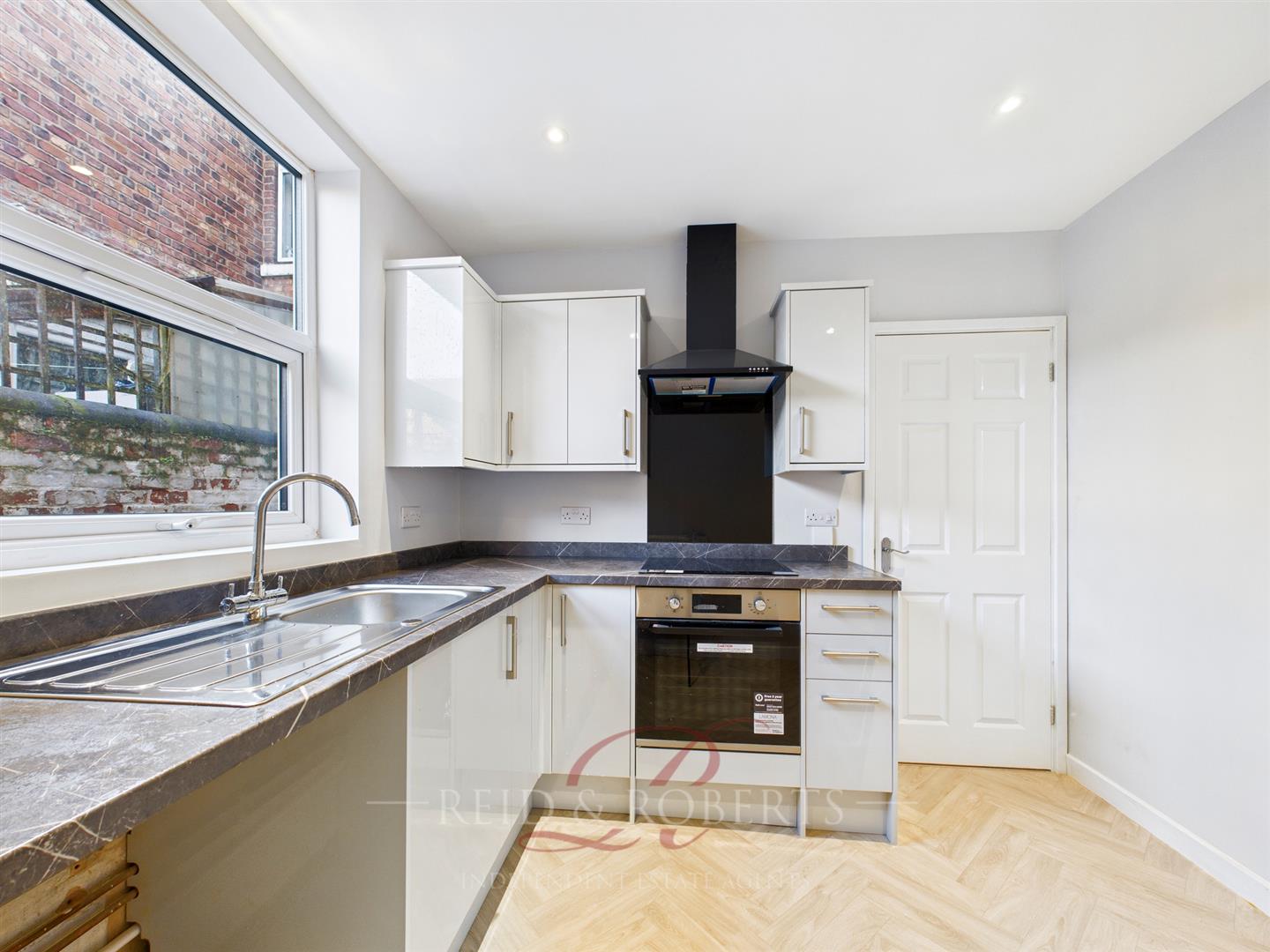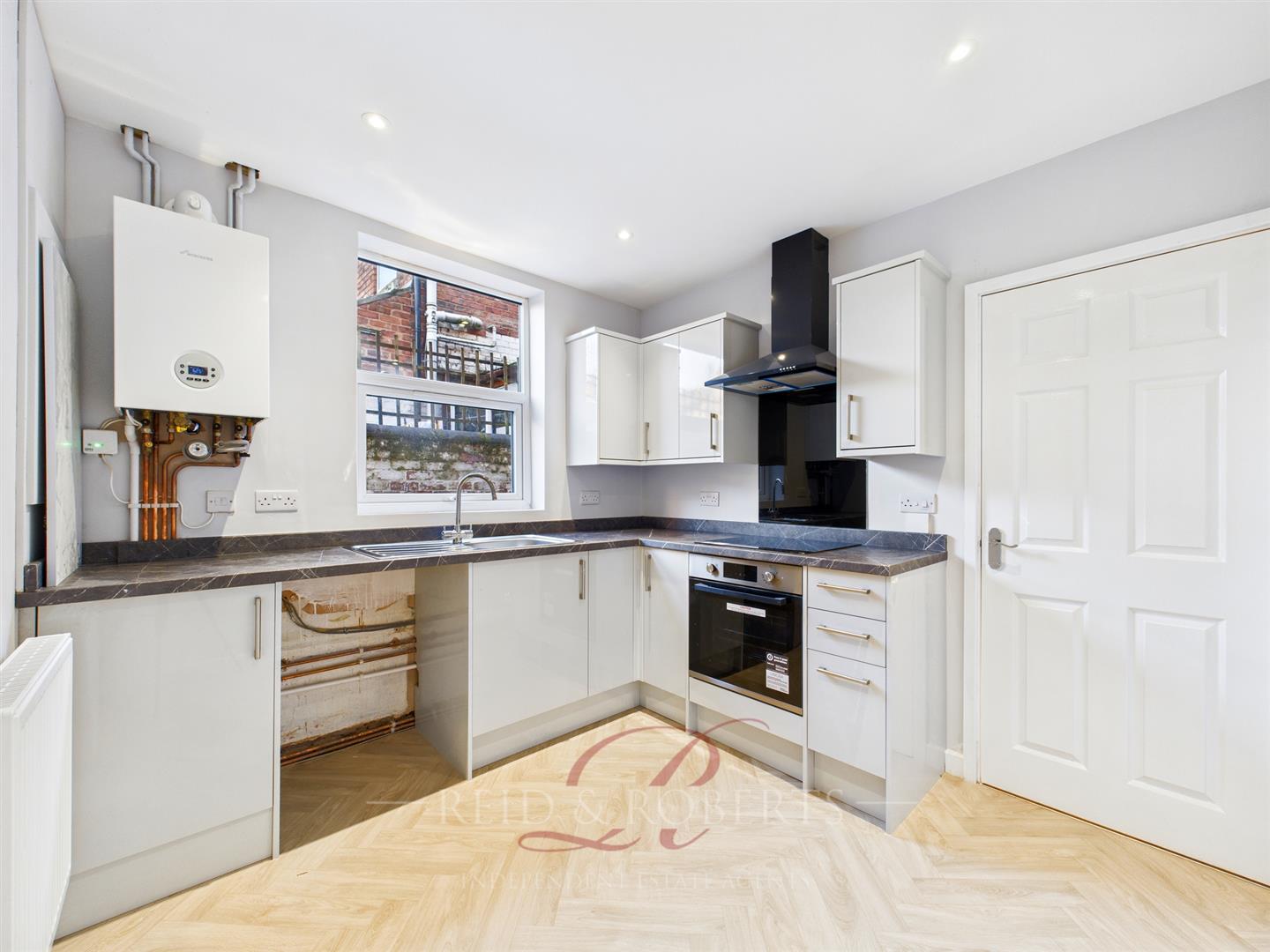 The newly fitted kitchen, features a comprehensive range of modern under-base units finished in high-gloss cabinetry. The kitchen is equipped with soft-close doors and drawers, a contemporary stainless-steel sink unit, and a selection of integrated appliances. These include an electric oven, a four-ring hob, and space for additional built-in appliances, providing both style and functionality for everyday living.