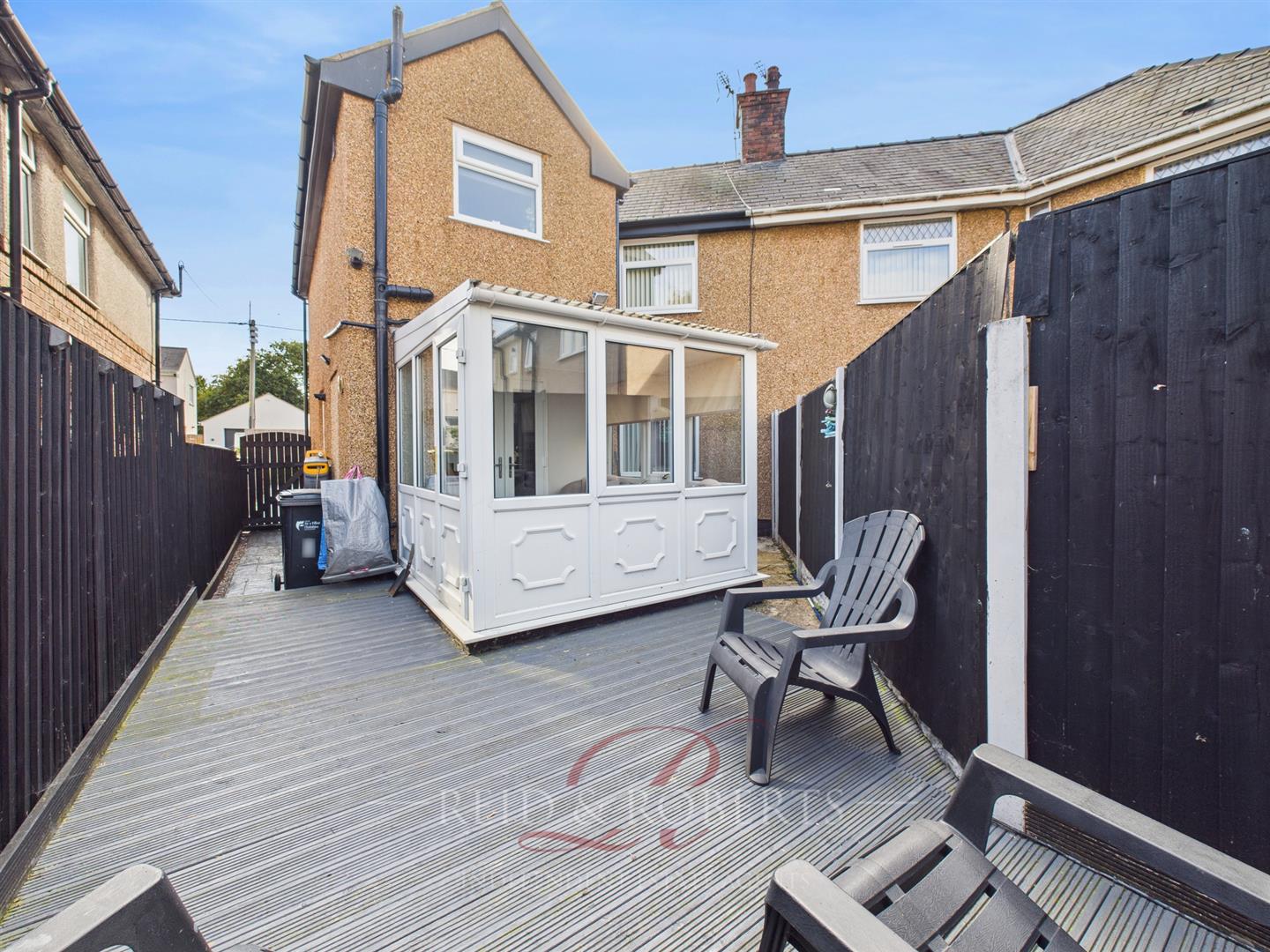 The property is approached via a generous driveway finished in low-maintenance imprinted concrete, offering off-road parking with an artificial lawn area, partially enclosed by attractive walling. A timber gate provides access to a private, enclosed courtyard, featuring timber decking and a handy timber garden store, all enclosed by fencing, creating a secure and versatile outdoor space.