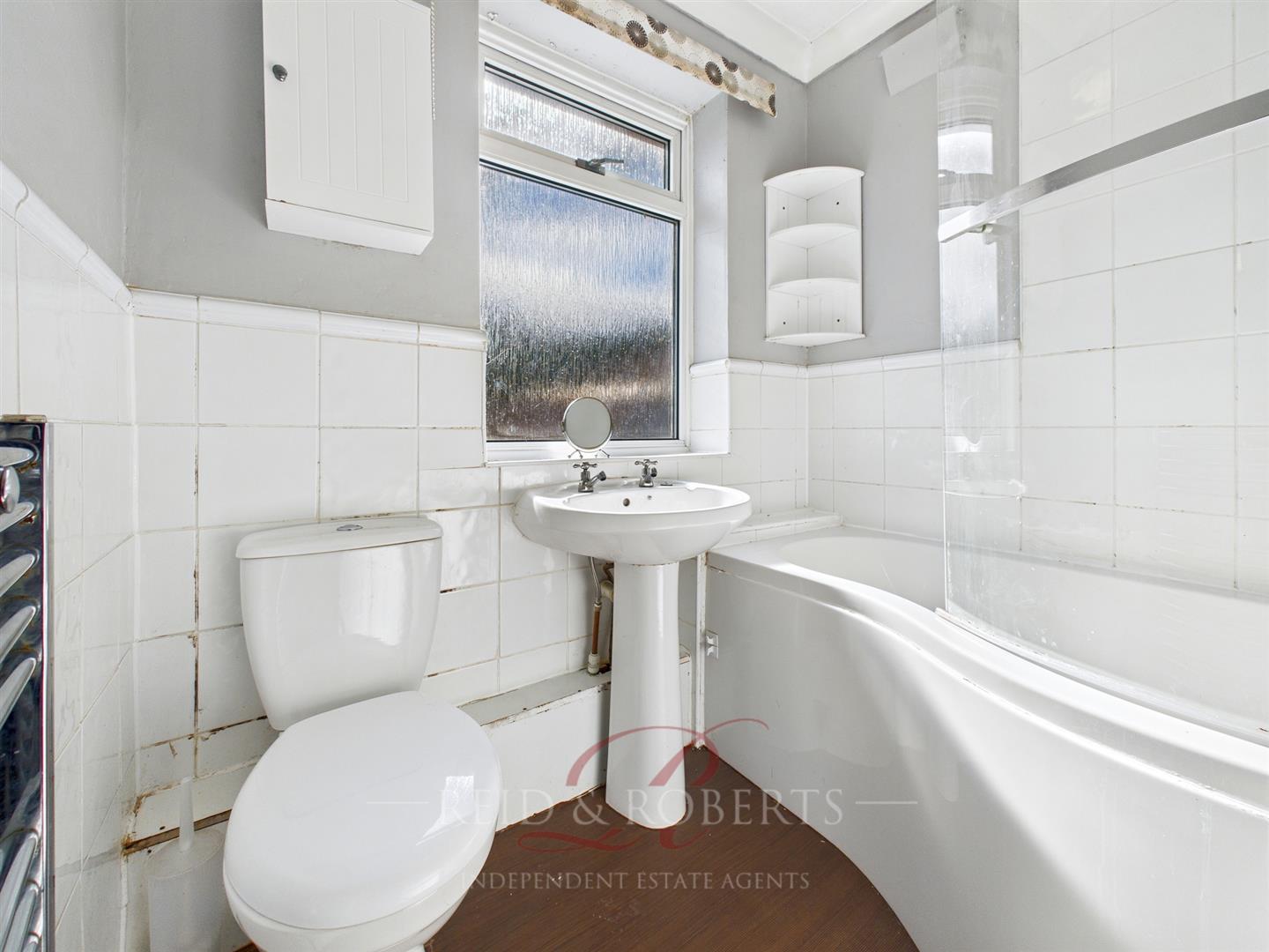 Three piece suite comprising a 'P' shaped bath with mixer tap and shower attachment over. Low flush W.C, pedestal sink unit with taps over, heated chrome towel rail, vinyl flooring, partially tiled walls, coved ceiling and Upvc double glazed frosted window to the rear elevation