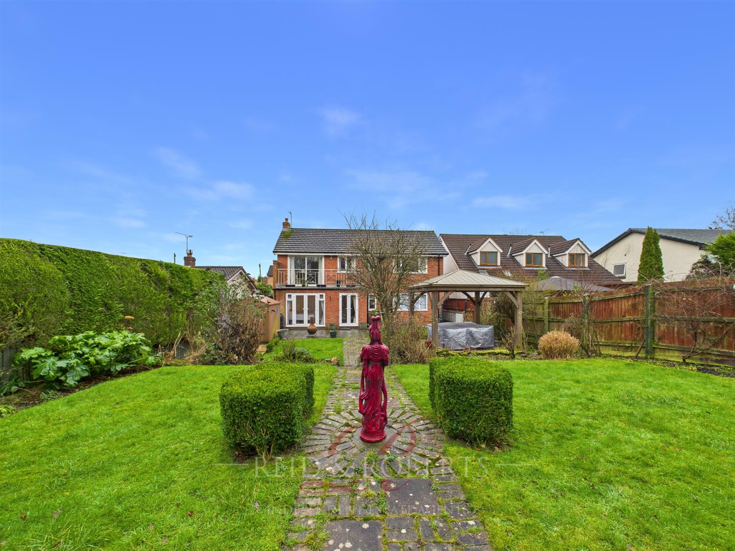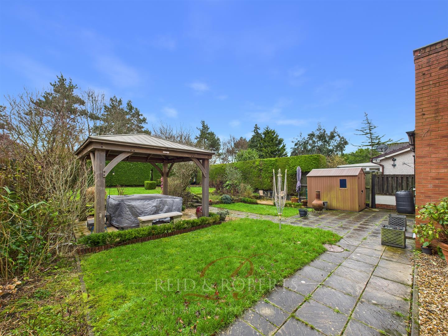 Externally, the home boasts a beautifully landscaped rear garden with a variety of patio and seating areas, lawned sections and a covered pergola space, all enjoying excellent privacy and with lovely tree's to the back. To the front, there is an attractive frontage with off-road parking for several vehicles.