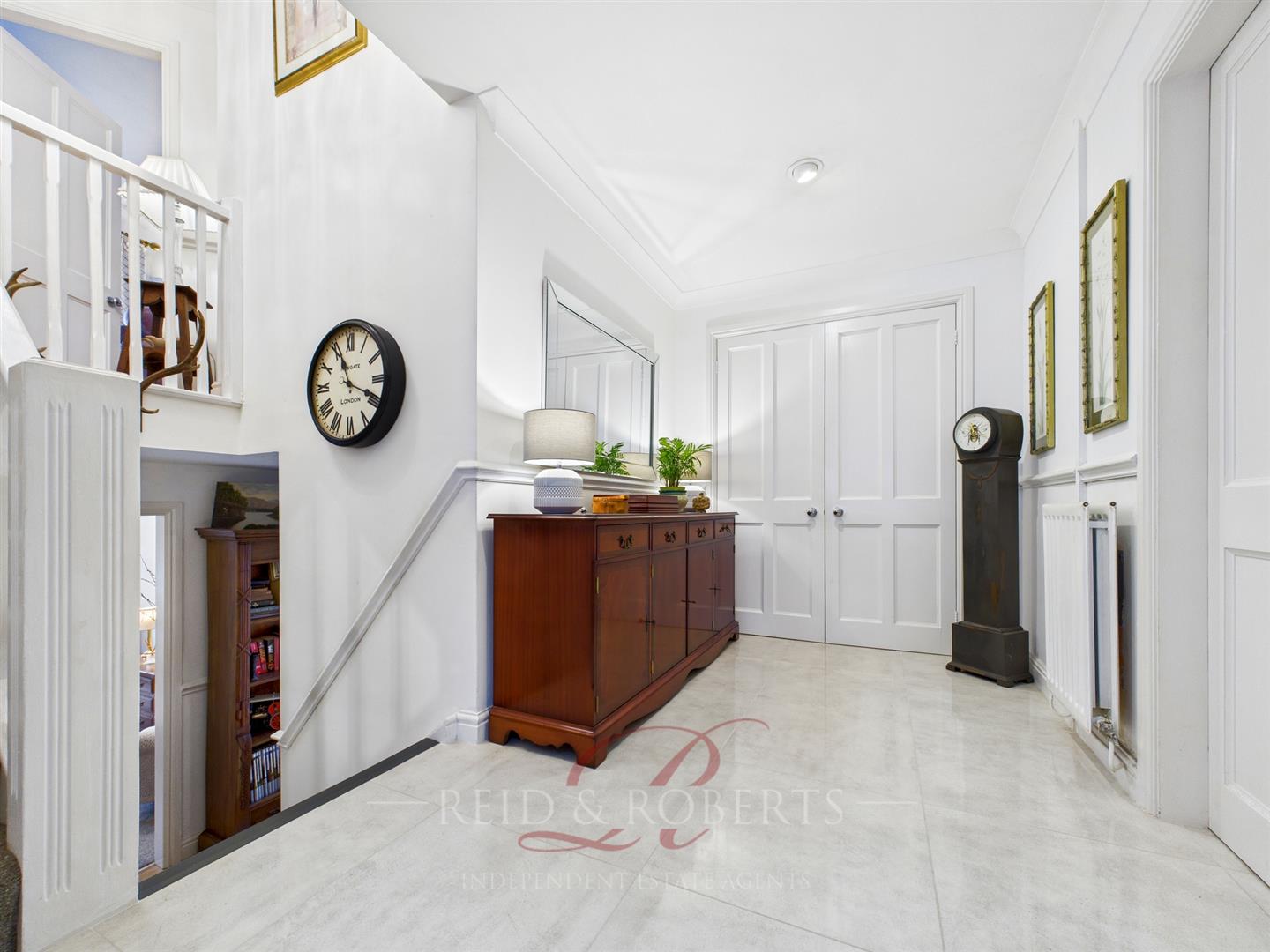 The composite front door opens into a spacious reception hallway finished with high-gloss tiled flooring. Features include a double panel radiator, dado rail, decorative coving, inset spotlights and wall-mounted heating controls. Double doors open into a useful storage cupboard, ideal for coats and shoes, while staircases provide access to both the upper and lower levels.