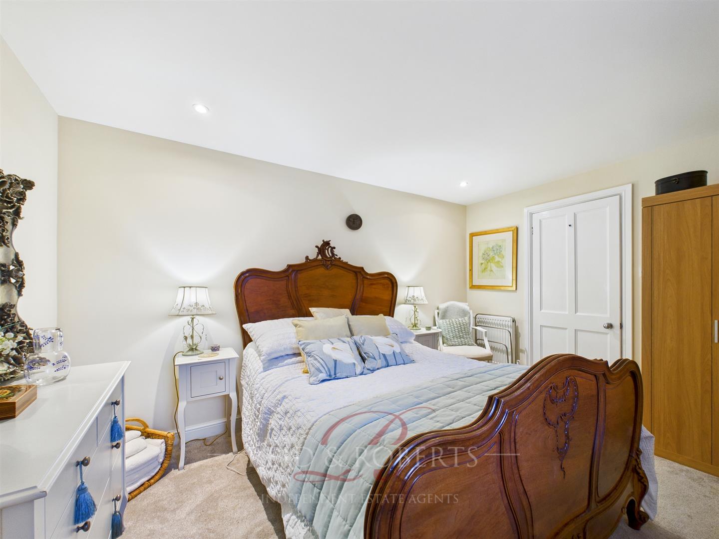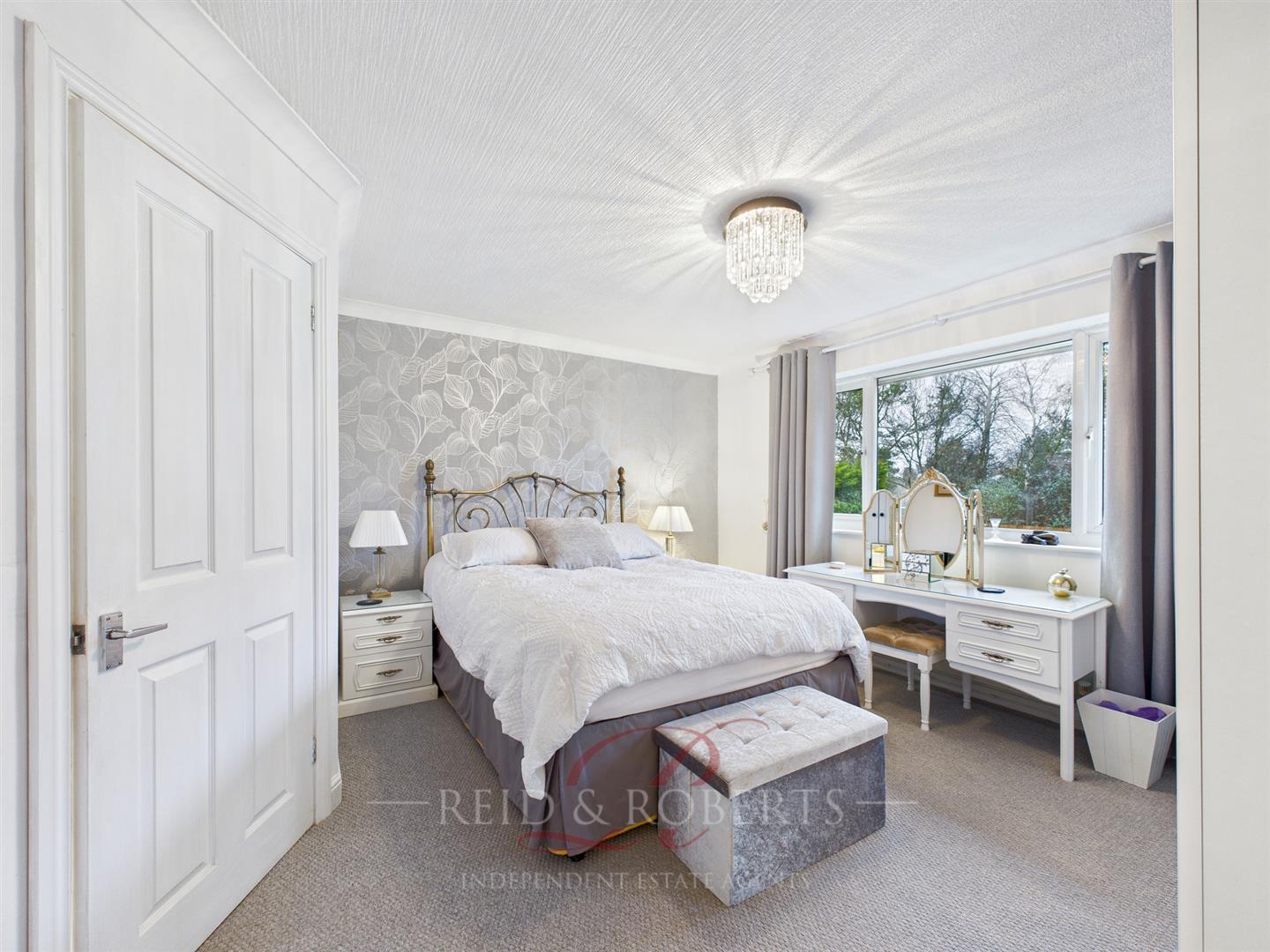 A generously sized main bedroom offering ample space for bedroom furniture, with fitted wardrobes and a dressing table. The room enjoys views over the rear garden and woodland beyond, providing excellent privacy.