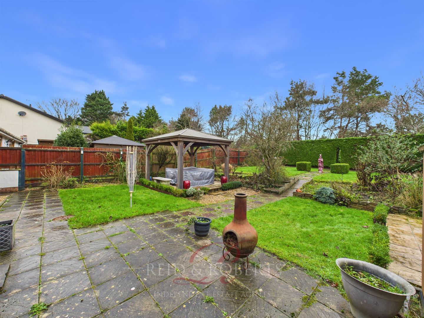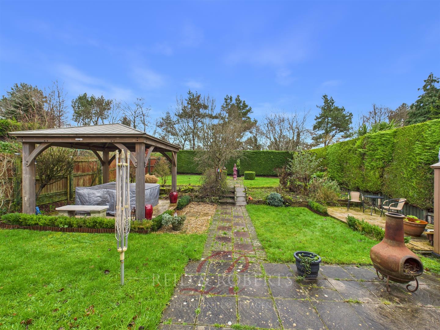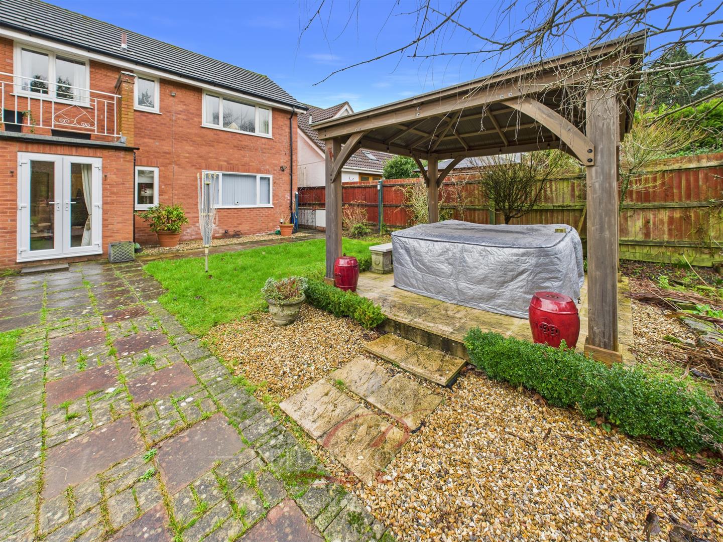 A beautifully landscaped garden with paved patio areas, decorative pathways, lawned sections and a raised patio with oak pergola. The garden enjoys a high degree of privacy, with mature trees forming a natural rear boundary.