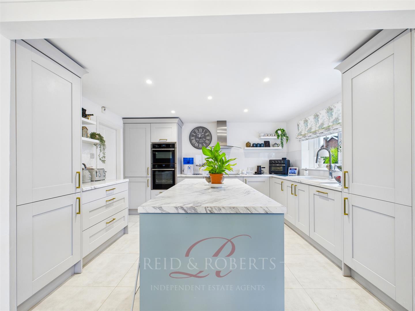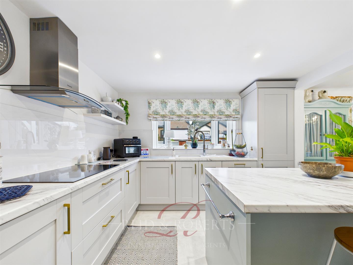 A stunning and expansive open-plan kitchen, breakfast and dining space, created by the current owners and forming the heart of the home. The kitchen houses a comprehensive range of modern wall and base units finished in light grey with gold handles, complemented by marble-effect work surfaces and a composite white sink with matching drainer and mixer tap.
