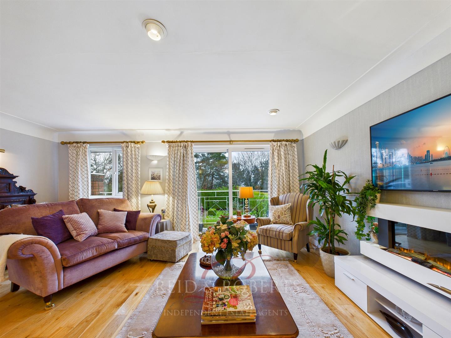 An impressive reception room with solid oak flooring, deep coved ceiling, inset spotlights and wall lighting. Features include a wall-mounted electric fireplace and sliding patio doors opening onto a balcony with iron railing overlooking the garden.