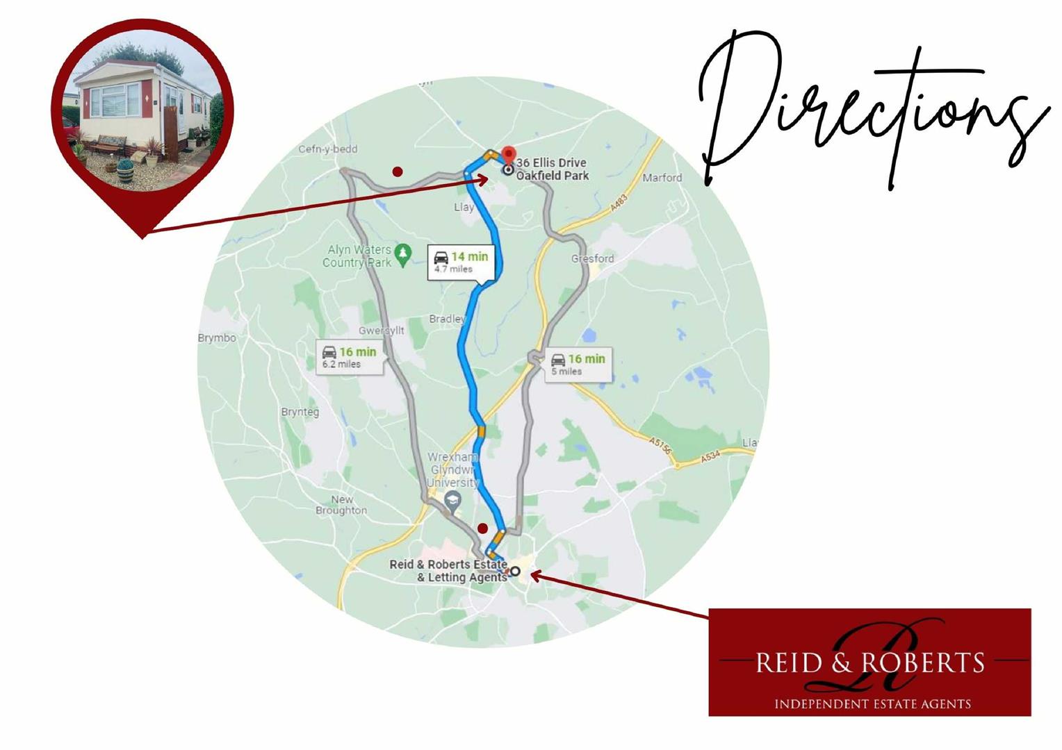 Proceed straight across through Rhosddu and Rhosrobin and on into Llay. Continue to the mini roundabout by the Legion and take a right turn and proceed to the traffic lights. At the traffic lights turn right onto Gresford Road and proceed along Gresford Road and Oakfield Park will be seen on the Right hand side.