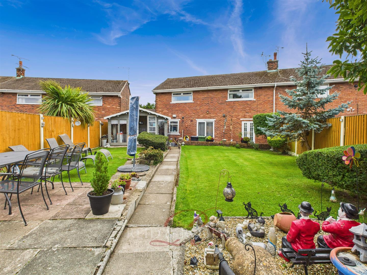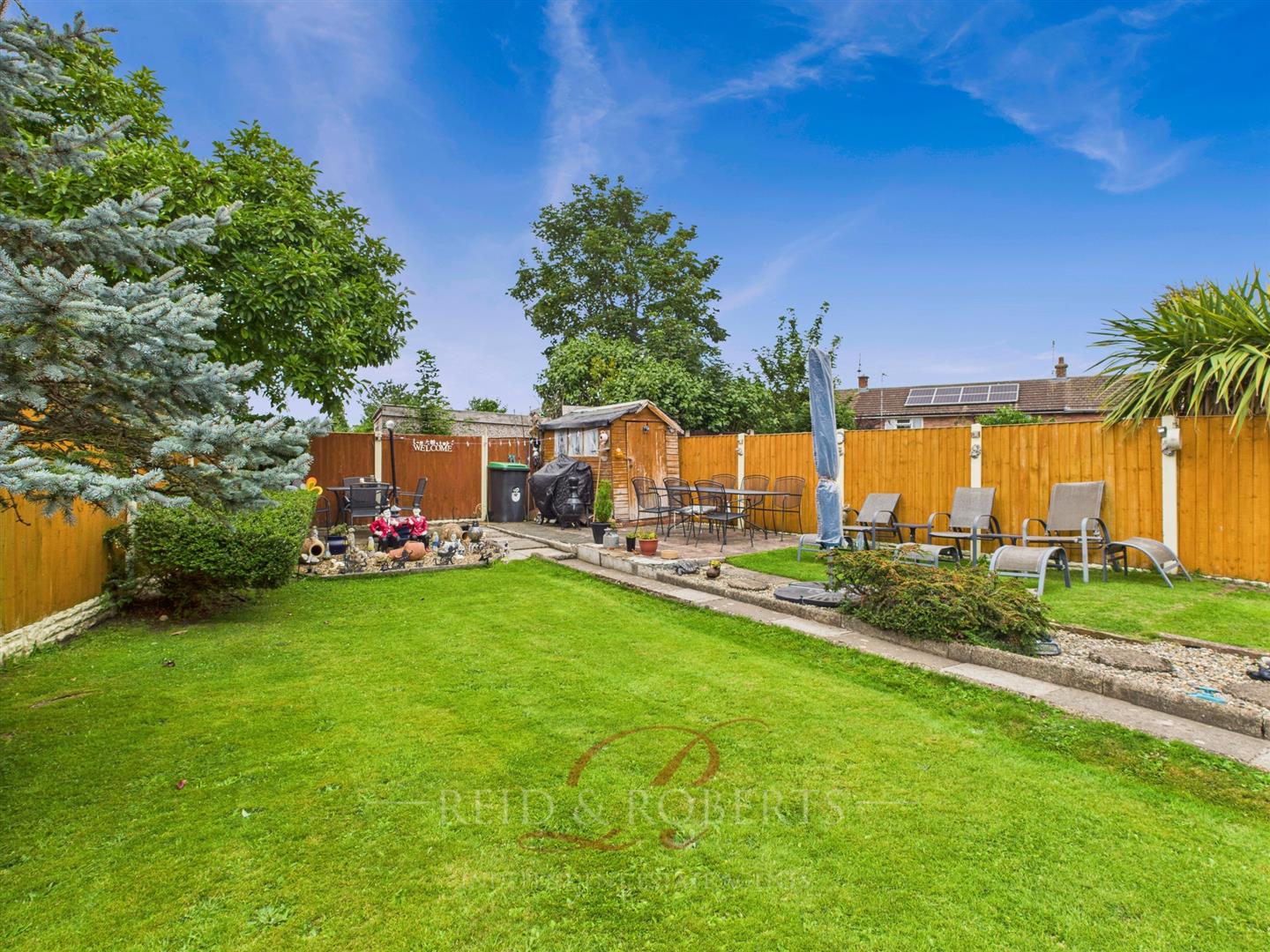 A beautifully maintained rear garden featuring a spacious lawn, mature plants, and a brick path with steps leading from the patio. Includes a wooden summer house for storage, a seating area, and attractive landscaping, perfect for relaxing or entertaining.