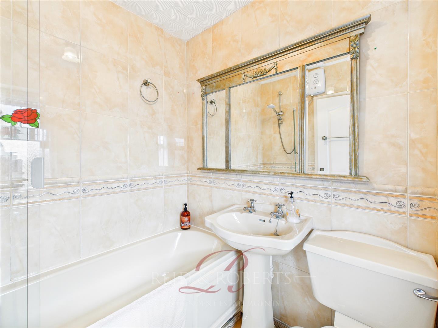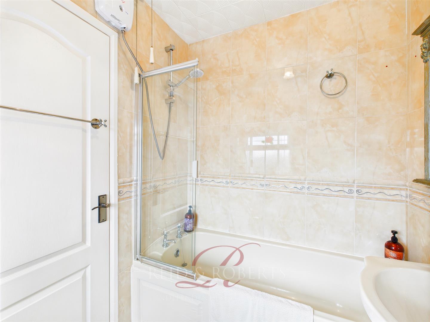 Fitted with a three-piece suite comprising a wood-panelled bath with Triton electric shower over, pedestal wash hand basin and low flush WC. Fully tiled walls and floor. Frosted UPVC double glazed window to the front elevation, radiator, ceiling light point and extractor fan.